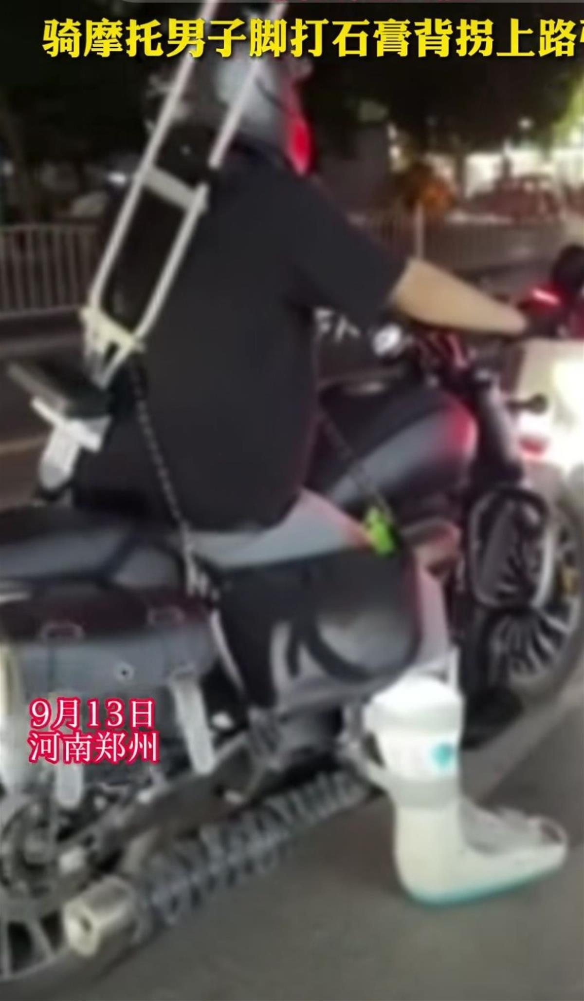 视频的拍摄者王女士在接受采访时称,9月13日晚上下班回家的路上,在郑州市中原区秦岭路上,她看到该男子脚上疑似打着石膏,背着一根拐杖在马路上骑摩托车。