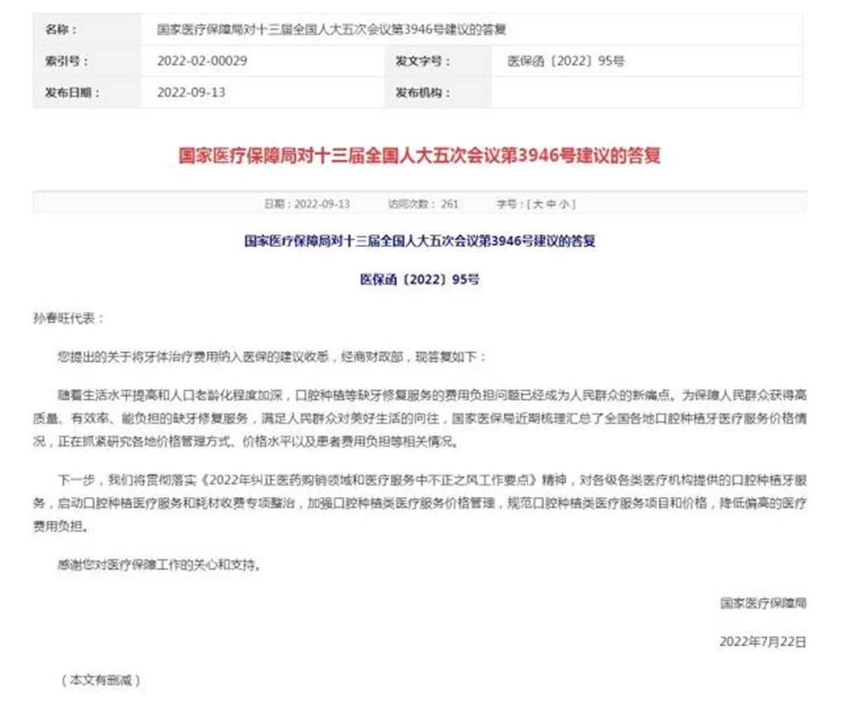 近日,针对人大代表提出的关于将牙体治疗费用纳入医保的建议,答复表示,国家医保局近期梳理汇总了全国各地口腔种植牙医疗服务价格情况,正在抓紧研究各地价格管理方式、价格水平以及患者费用负担等相关情况。(据9月14日中国新闻网)