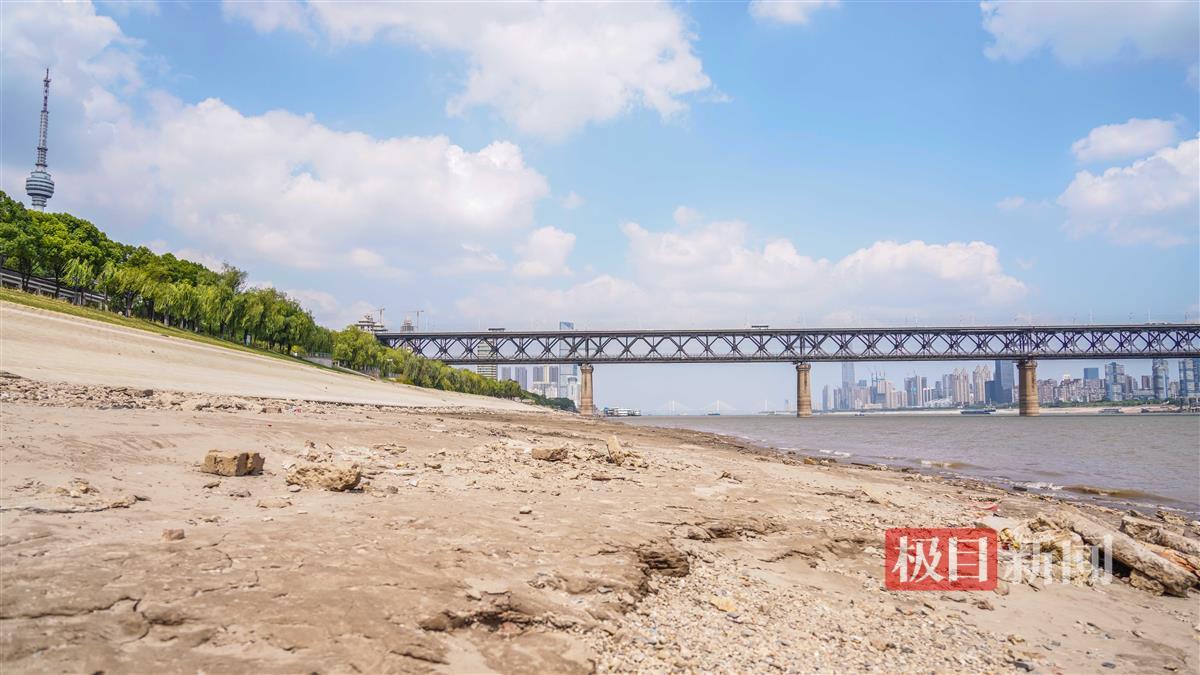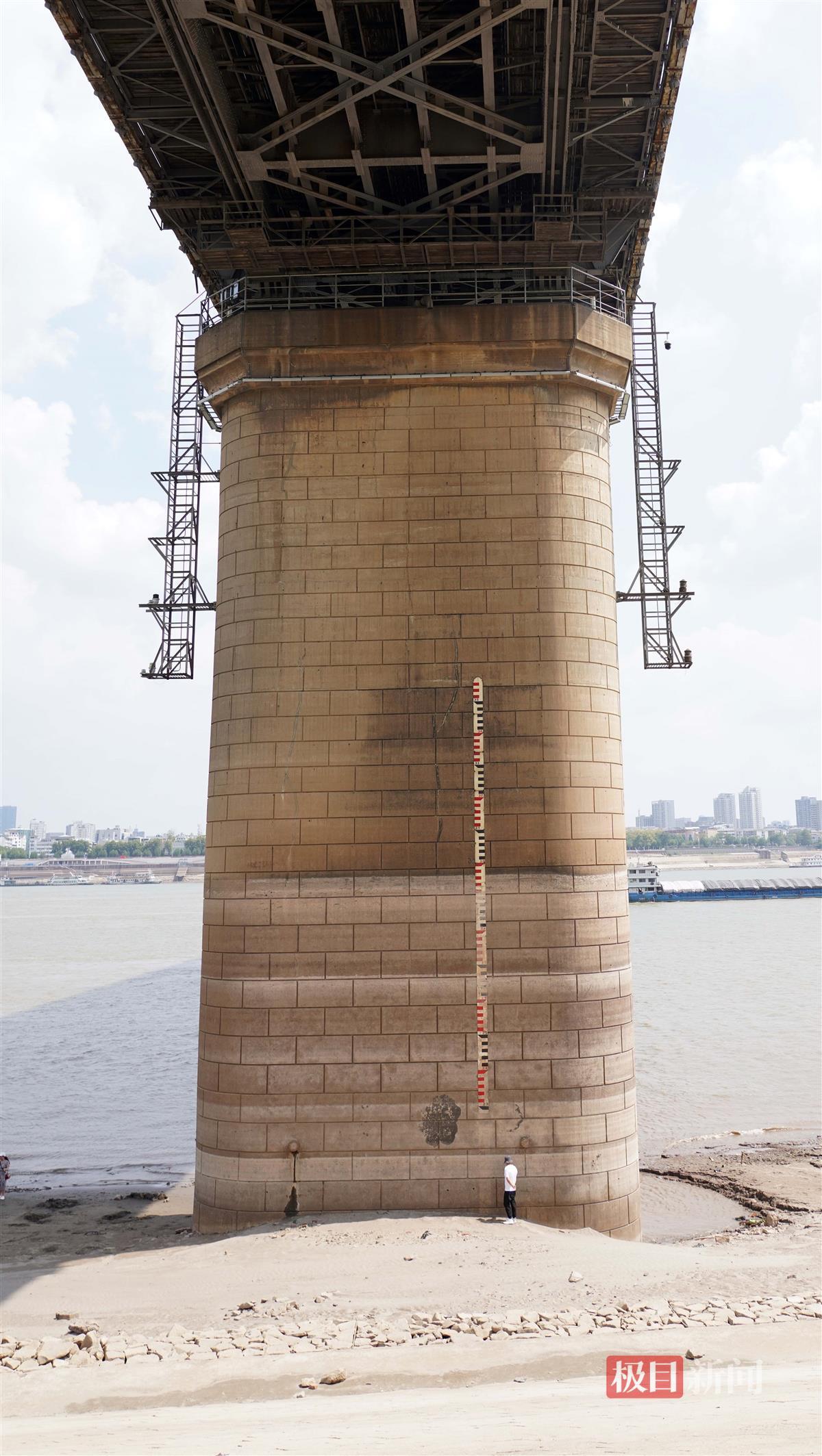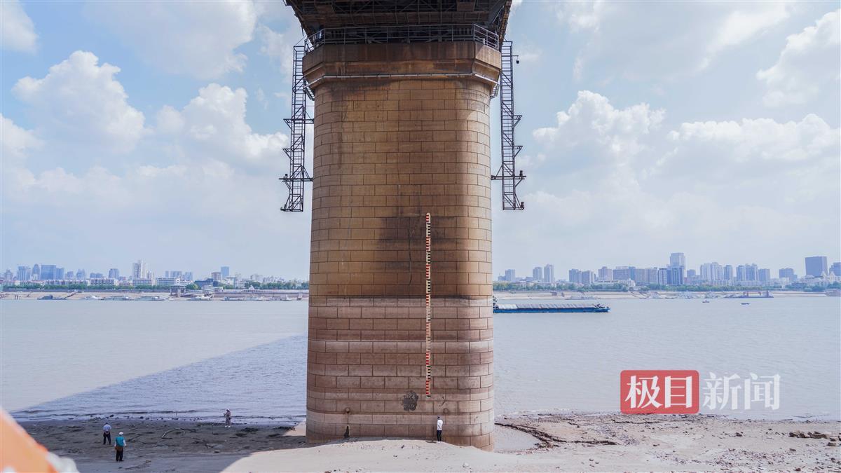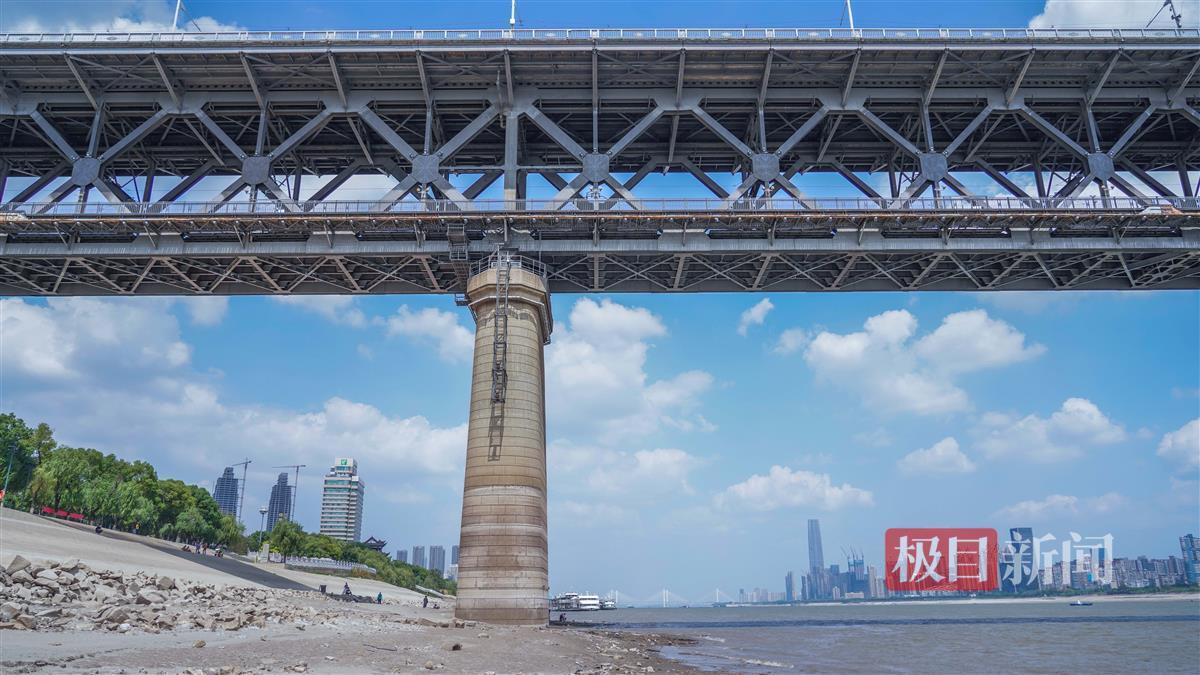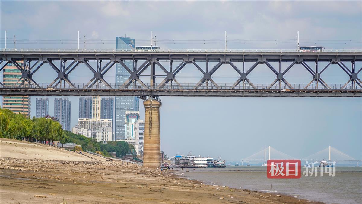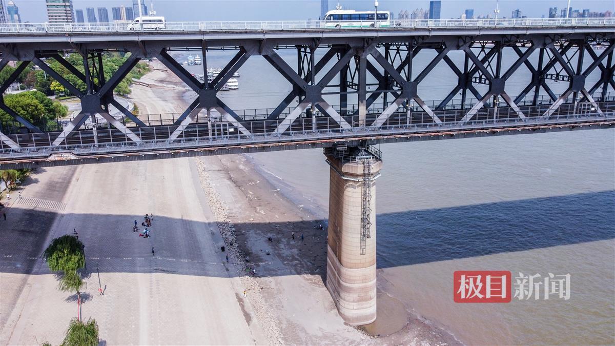 9月14日16时,汉口(武汉关)水位是13.51米,较历年同期日均值偏低8.64米,武汉长江大桥1号桥墩离开水面,成了大桥的陆地“旱脚”。
