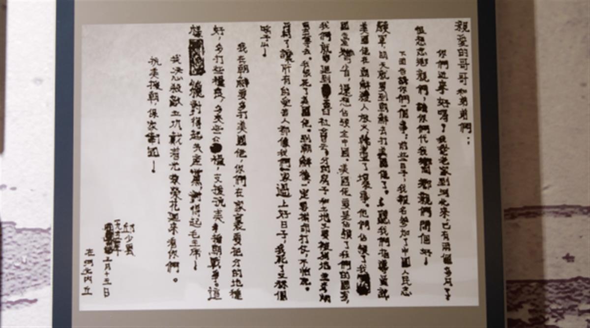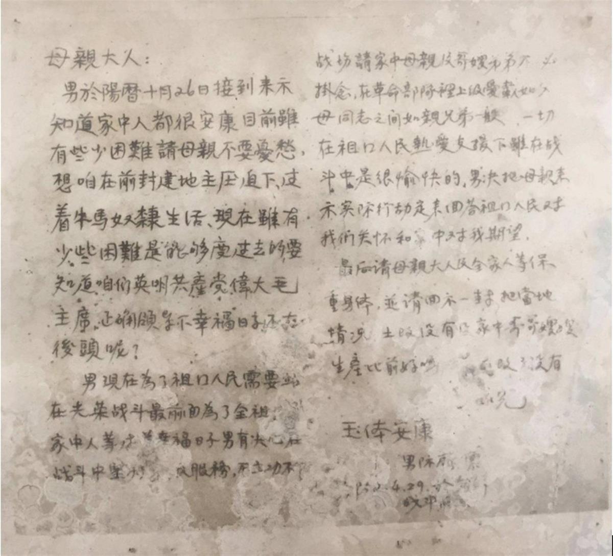 他在家书中写道,到朝鲜后一定要拼命打仗不怕死,“为了让所有的受苦人都像我们一家过上好日子,我死了又算个啥子么?你们在家要把分的地种好,多打些粮食,多交些公粮,支援抗美援朝,这样总对得起共产党、对得起毛主席!”“我决心杀敌立功,戴着光荣花回来看你们。抗美援朝,保家卫国!”