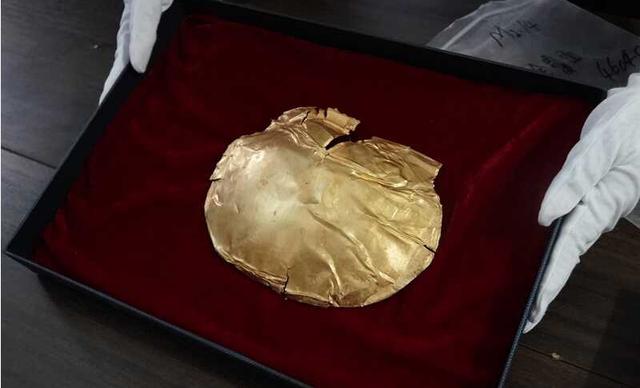 据介绍,该金覆面长18.3厘米、宽14.5厘米、重40克左右,四边略微向内弯曲。专家推测,其下钩挂有机质的衬托物,覆盖在墓主人脸上。