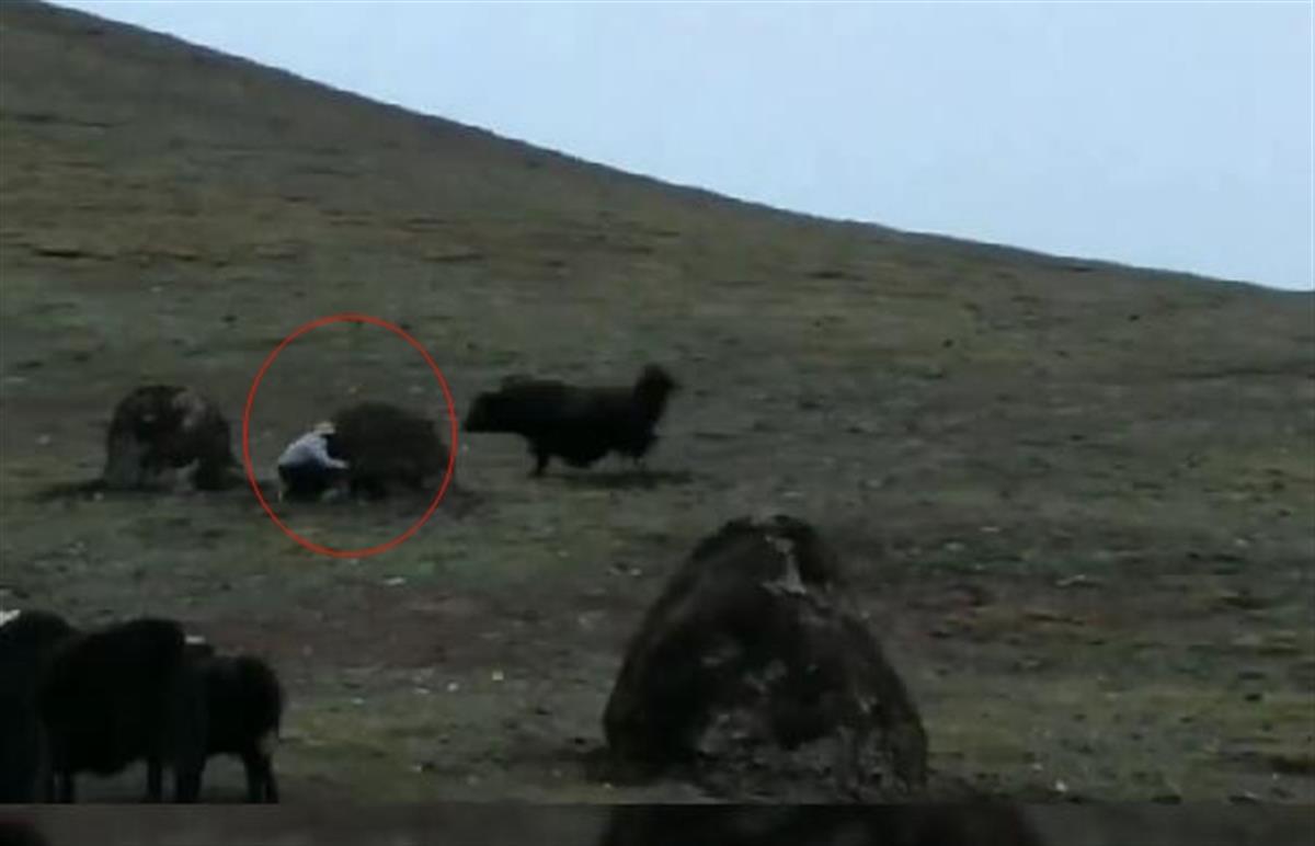 据网友发布的视频显示,在一处山坡的草地上,一头体型硕大的牦牛正在快速奔跑冲向一男子,男子见状蹲在牛粪堆后躲避,牦牛扑了个空,急转头停了下来,男子继续绕着牛粪堆走,以此躲避牦牛的视线,最终,牦牛没有发现男子,便转身走开了。视频发布者表示,这惊险的一幕发生在青海格尔木唐古拉山镇的沱沱河牧区,野牦牛混进家养牦牛中,还袭击家养牦牛的主人。