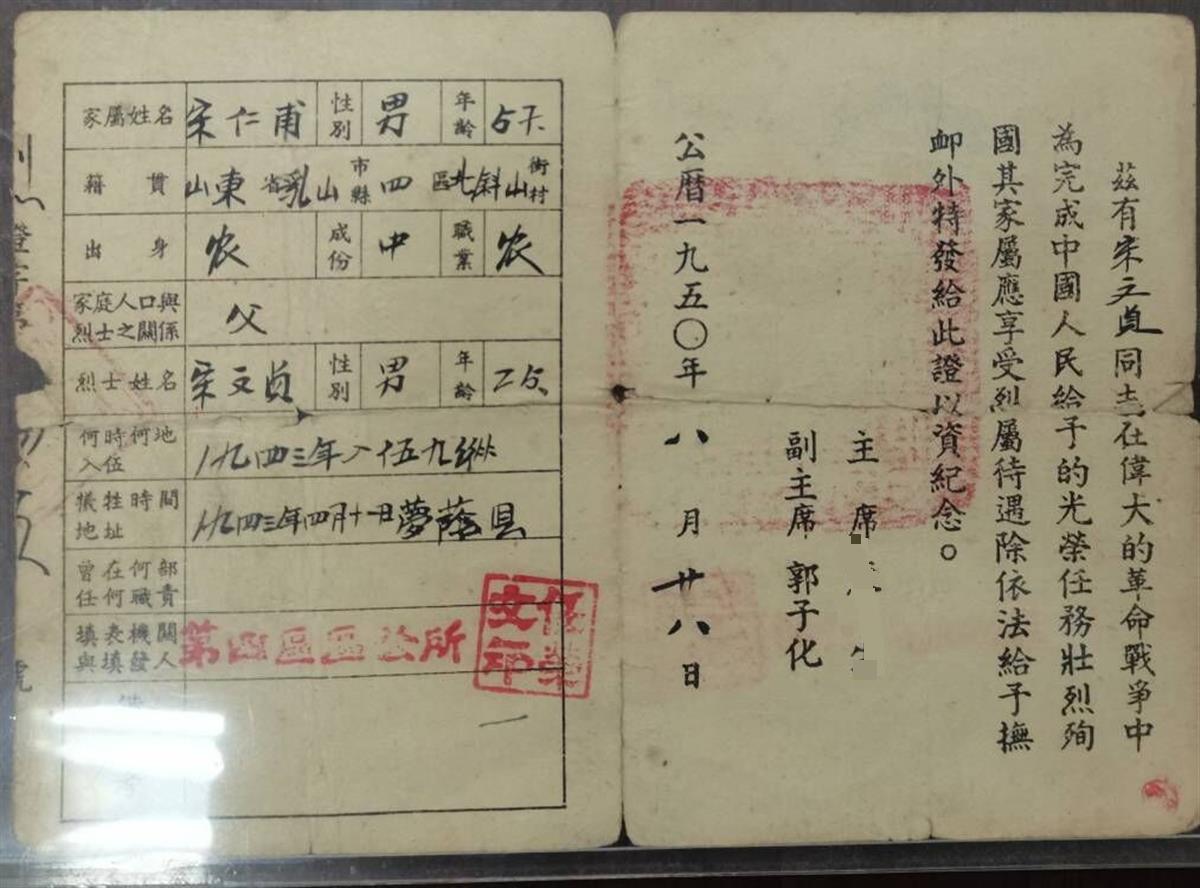9月23日,一张“漂泊”在外72年的烈士证终于要回到亲人的手中,它属于山东威海乳山籍烈士宋文祯。