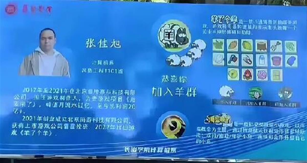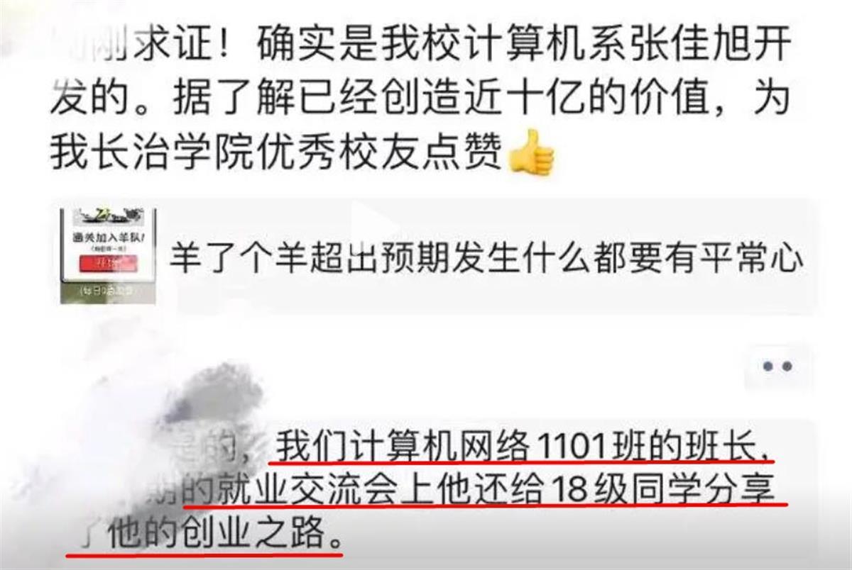 网传视频显示,在一块标注有“长治学院”字样的展板提到,张佳旭曾在长治学院计算机系网络工程1101班就读,2017到2021年在北京豪腾嘉科担任游戏制作人。2021年创业成立北京简游科技有限公司,获得上市游戏公司雷霆投资,2022年推出游戏《羊了个羊》。另有视频显示,张佳旭曾担任1101班的班长,还曾向18级学生分享过创业经历。