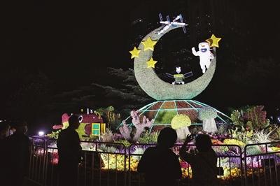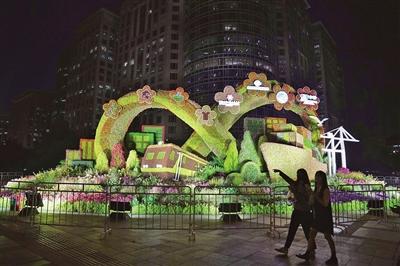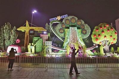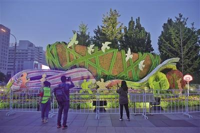 9月26日,西单东北角,“健康生活”花坛点亮后,吸引了人们来拍照。新京报记者李木易摄