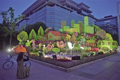 9月26日,西单东南角,“绿色生活”花坛点亮。新京报记者李木易摄