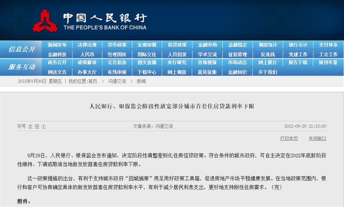 9月29日晚,人民银行、银保监会发布通知,决定阶段性调整差别化住房信贷政策。符合条件的城市政府,可自主决定在2022年底前阶段性维持、下调或取消当地新发放首套住房贷款利率下限。该通知的出台,一时间成为行业热点,堪称又一个“930新政”。