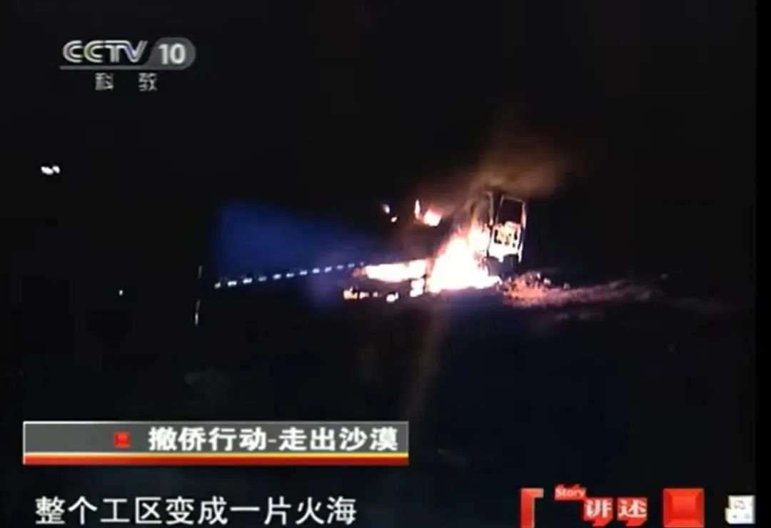 被放火的中国工地。来源/纪录片《撤侨行动-走出沙漠》截图