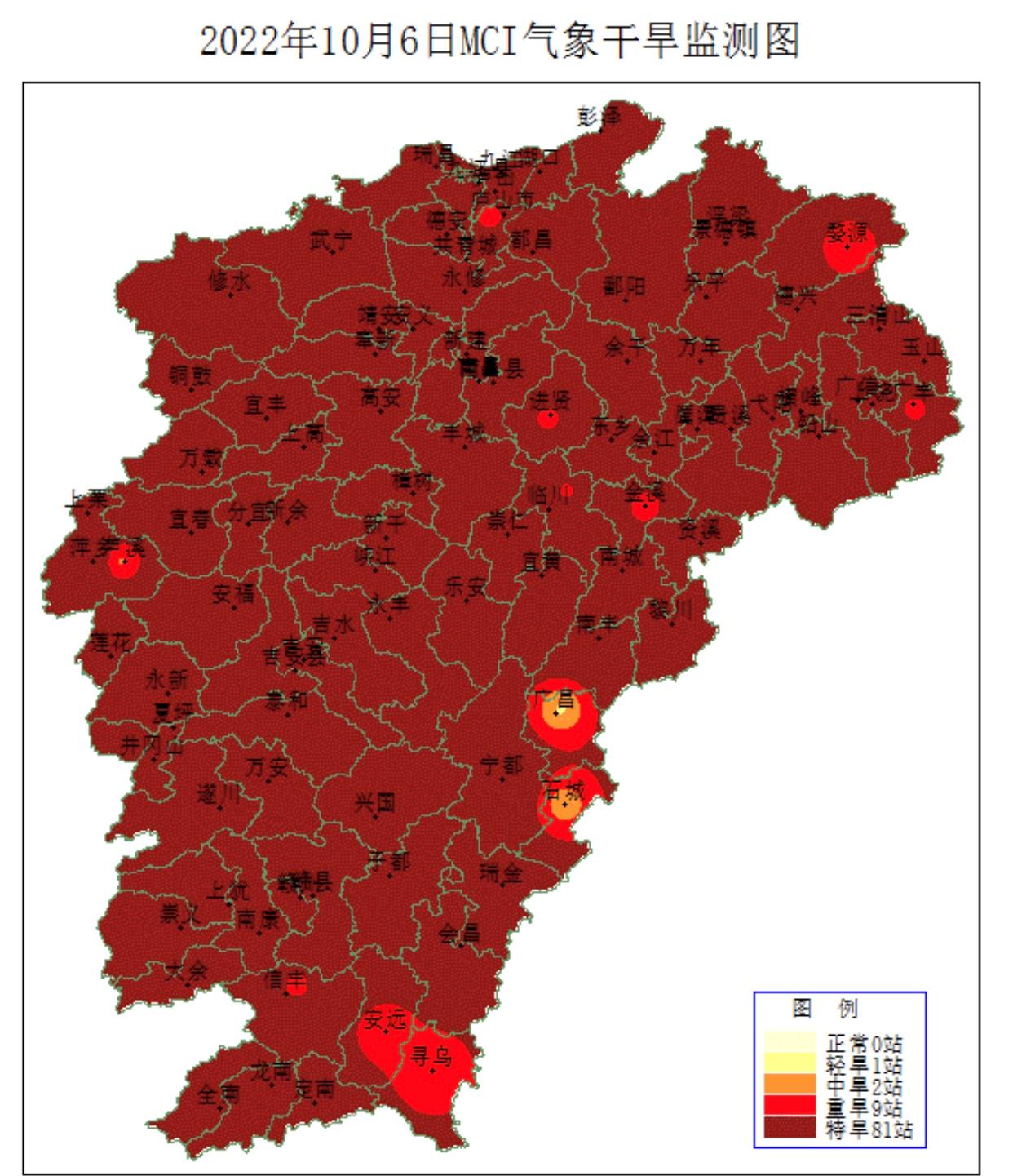 记者从江西省气候中心获悉,今天是江西持续87天出现重度气象干旱,下午2点11分,省气候中心发布干旱红色预警,根据10月6日综合气象干旱指数监测显示,江西省有97%的县(市、区)达到重至特旱。预计未来7天江西省气象干旱仍将持续,请各地各有关部门继续做好干旱防御工作,城乡居民注意节约用水。