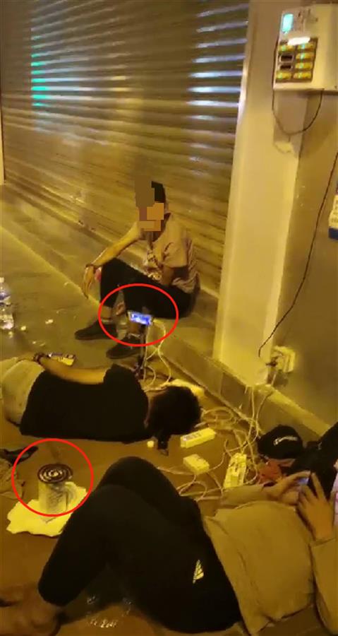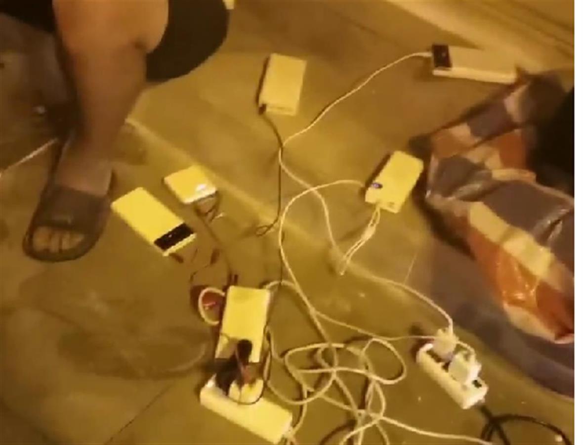 王女士提供的多段视频显示,多名路人在店铺门口租赁充电宝设施下方充电,有路人深夜自带插座、充电宝来充电,甚至路人点上蚊香,躺在地上,边充电边看剧。