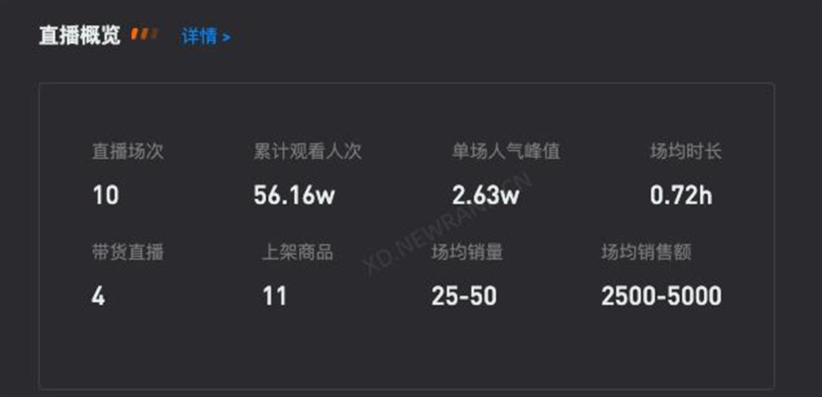 赢得关注的同时,带货数据却并不理想。10场直播累计上架了11件商品,场均销售量25-50件,场均销售额在2500-5000元。