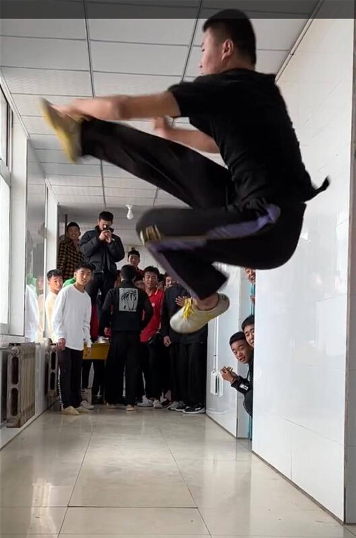 吴教练拍摄的视频显示,学生们在走廊里,有的表演空翻、二指禅等高难度动作,有的则展示武术套路,引来其阵阵掌声和叫好声。