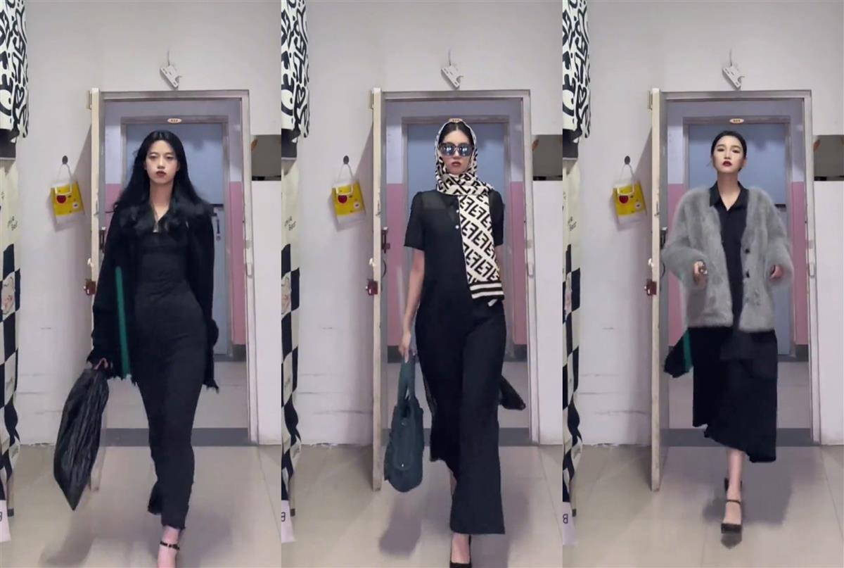 视频中,最后一个出场走秀的余同学,身穿黑色长裙,外搭仿皮草外套,整个人气场十足。10月15日,余同学告诉极目新闻记者,视频中的几个女生,都是中原工学院服装表演专业的大一新生,大家是同一个宿舍的,“之前我和室友们刷到了其他服装表演同学拍摄的视频,便也想挑战一下这个热点,所以就一起策划了那场拍摄。”