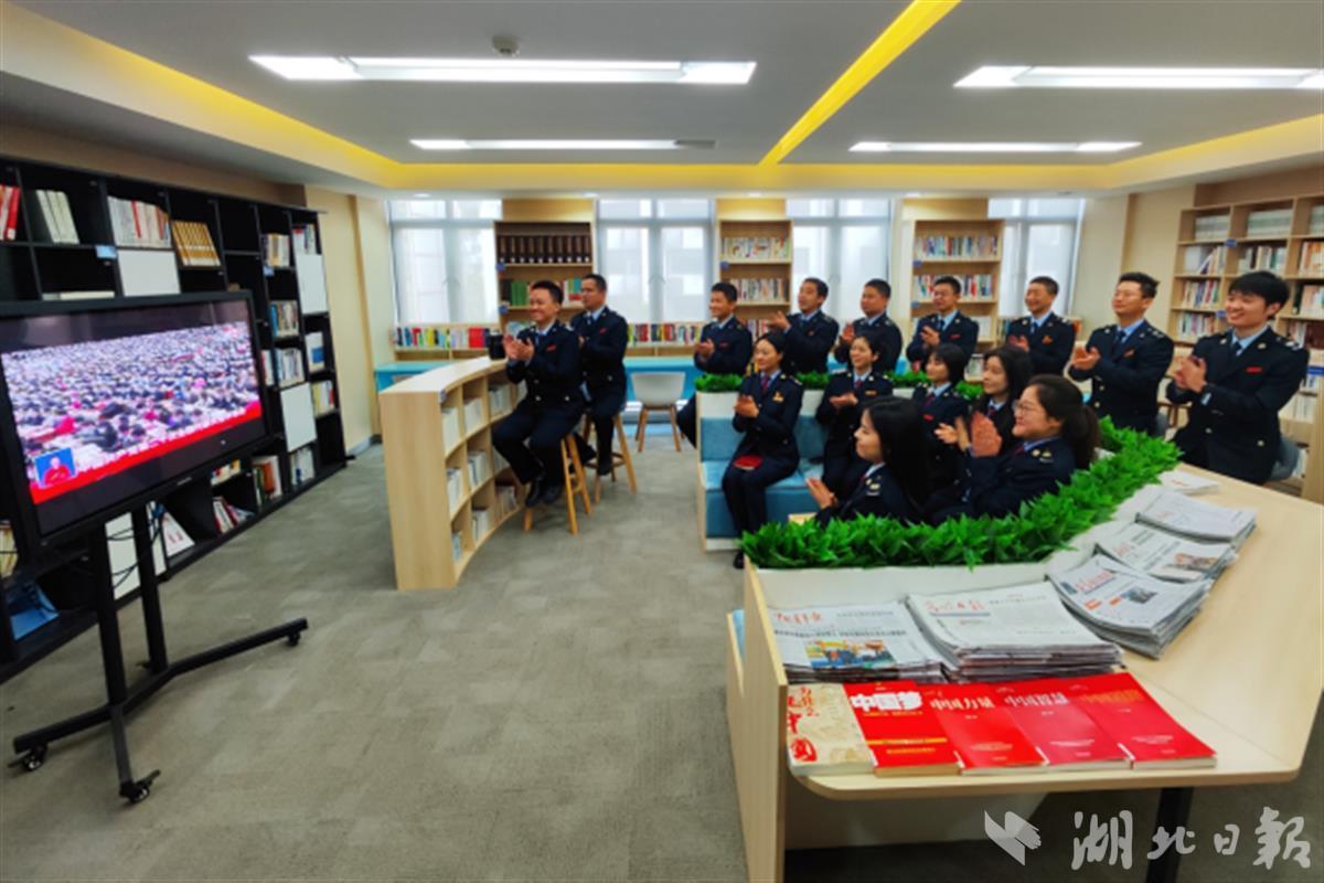 咸宁崇阳县税务局干部职工整装收听收看开幕会直播盛况,跟着总书记报告共同回顾十年来党和人民事业发生的神奇巨变,畅想未来发展蓝图。干部职工们感叹道:“身处伟大光荣英雄的时代,身系神圣崇高的税收事业,我们没有理由不珍惜岗位,不努力工作。”