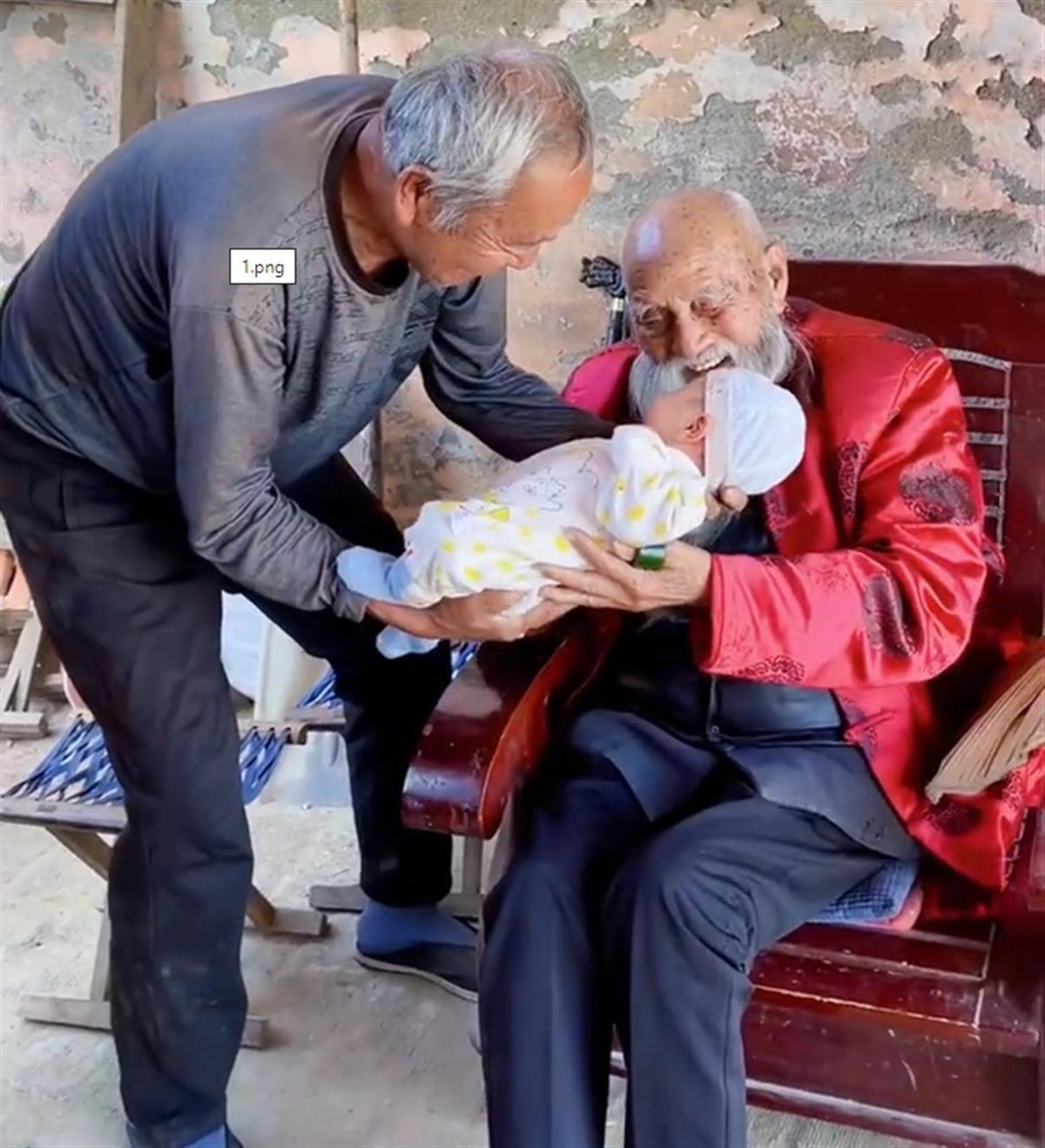 曾火爆一时的“一家人五代同堂接力抱满月宝宝”视频,里面的主人公就是这位“仙翁爷爷”。