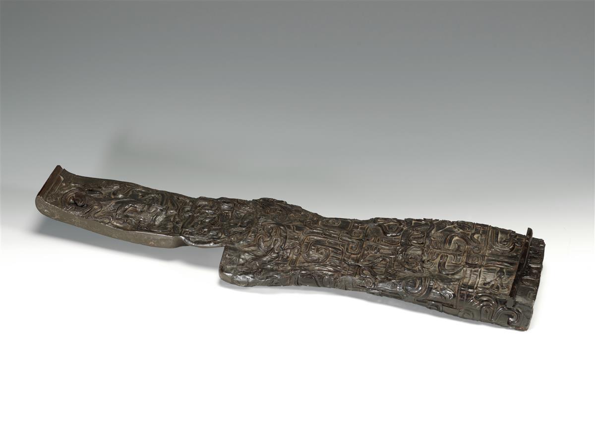 该琴出土于湖北枣阳九连墩2号墓,通体涂黑漆,上朱绘纹饰,具有浓郁的楚文化特征,是迄今所见先秦至西汉时最精美的古琴之一。琴身分为音箱与尾板两部分,面板呈曲线状,琴头微上昂,腰部下凹,尾板微翘,其下有拴弦柱。据专家分析,十弦琴在战国时代还承担着法器的角色,用于祭祀时与天地沟通。