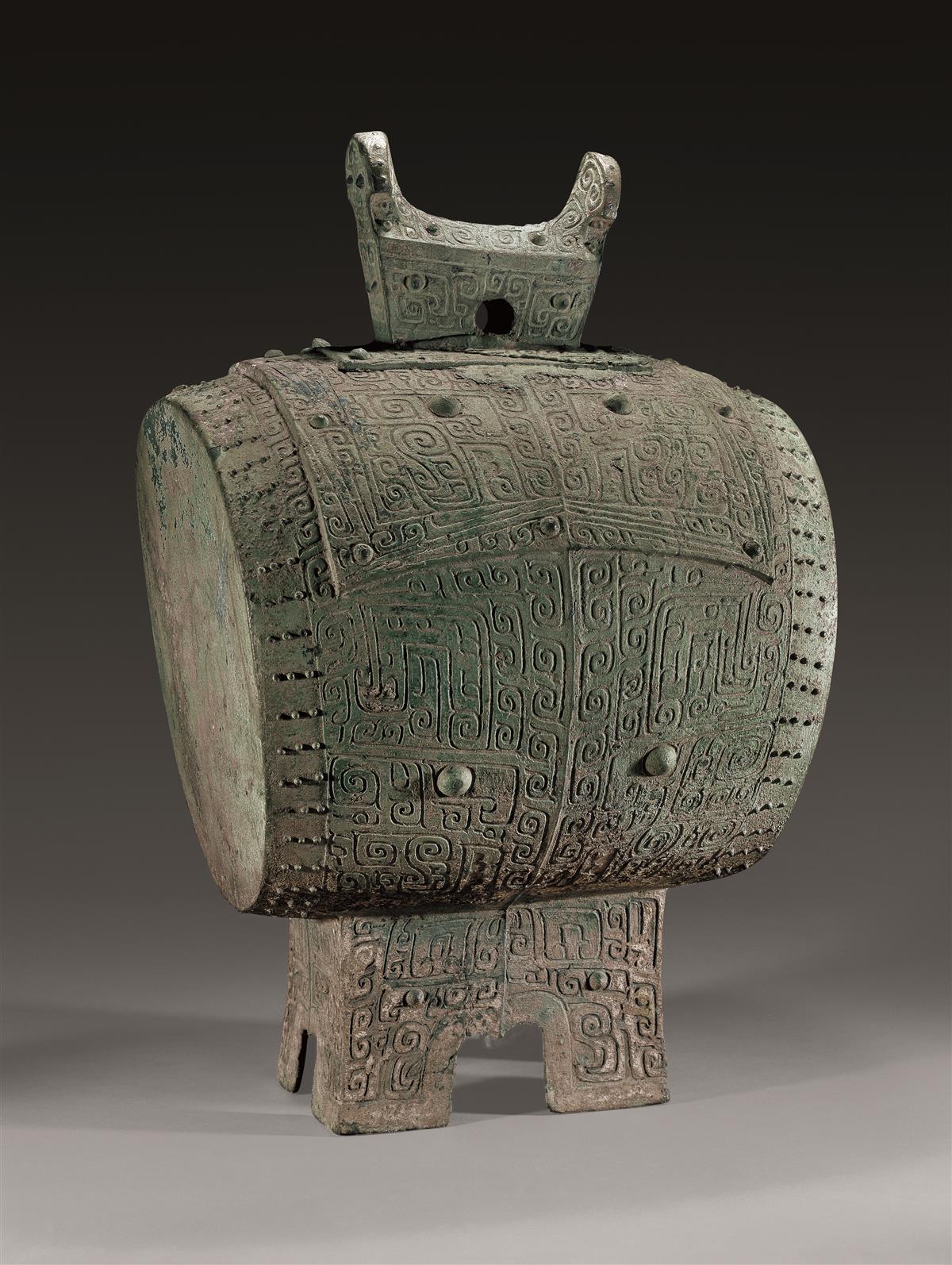 铜鼓是具有地域特色的打击乐器,这件崇阳铜鼓于1977年发现于湖北崇阳县,通高75.5厘米,由铜鼓身、铜鼓座和铜鼓冠三部分组成。圆形仿皮质鼓面无纹饰,鼓身、鼓座和鼓冠上均铸有商代后期流行的具有装饰纹样云雷纹和乳钉纹。铜鼓质地厚实古朴,花纹流畅粗放,被网友形容为“看上去就雄赳赳的,很有气场”,代表了我国商代青铜工艺的制作特点与水平。