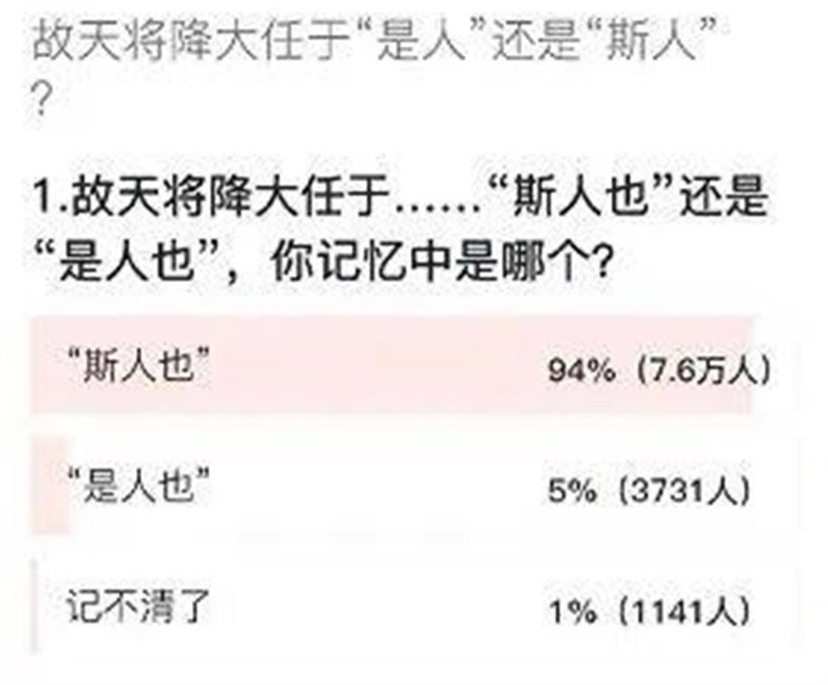不管是何原因造成的“误记”,“是人”“斯人”在网络上一讨论,让大家集体重温了初中课本里的《生于忧患,死于安乐》一文的相关语句,算是集体又上了一次语文课,而且有寓教于乐的效果,这比单纯的背记轻松多了。经这一讨论,上了热搜,印象深刻。哪怕以前是记错了,这回也明白了,人教版课本用的是“故天将降大任于是人也”,这才是正确答案,考试时当以此为准哦。