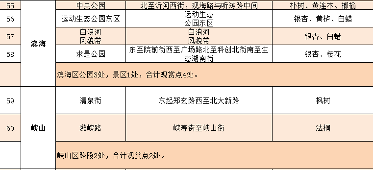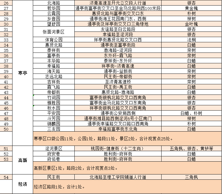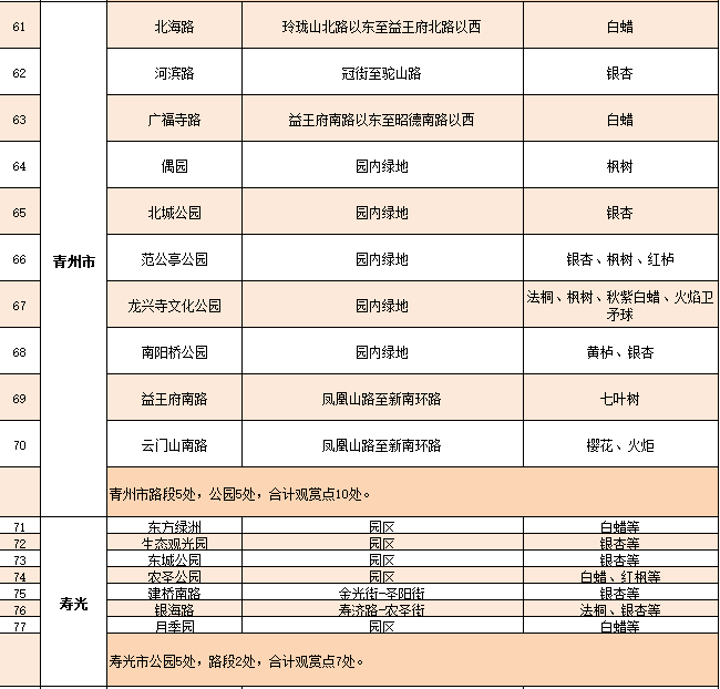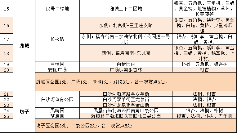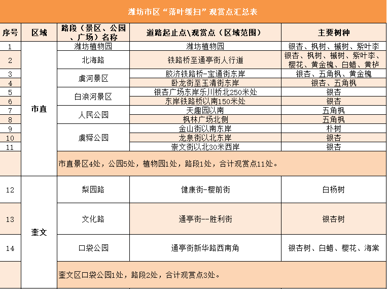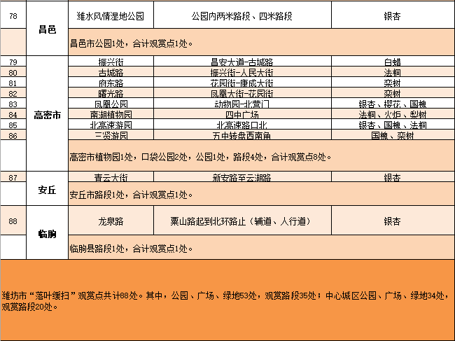 记者注意到,今年潍坊市“落叶缓扫”观赏点共计88处。其中公园、广场、绿地53处,观赏路段35处,中心城区公园、广场、绿地34处,观赏路段20处。今年昌邑市、高密市、安丘市、临朐县、寿光市、青州市都参与“落叶缓扫”活动,仅青州就推出10处赏叶点。