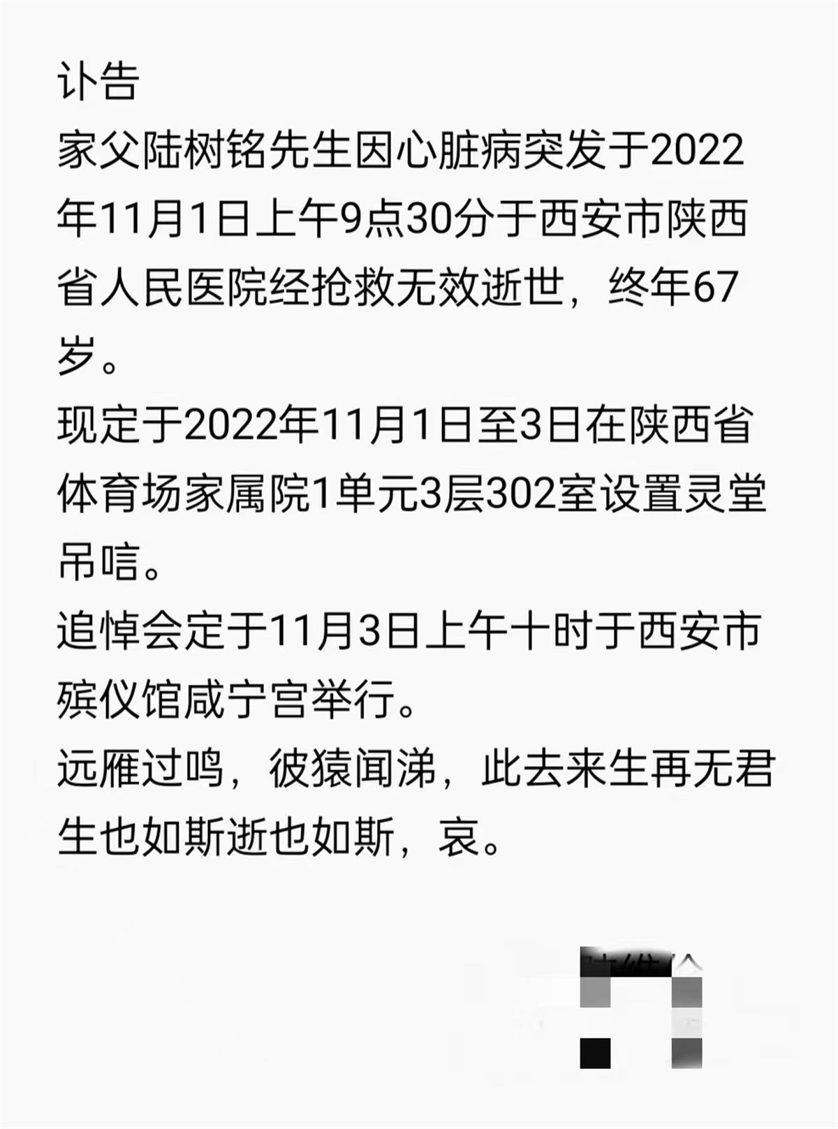 1日晚,陆维伦正在家中忙着料理父亲的后事。他告极目新闻记者,父亲是因心脏病突发,于11月1日9时30分在陕西省人民医院经抢救无效逝世。