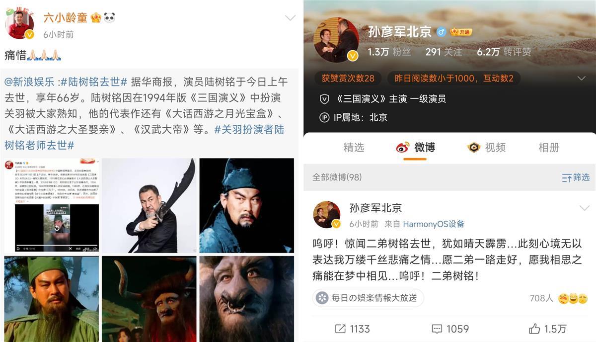 刘备扮演者孙彦军、演员六小龄童等纷纷发声悼念(微博截图)