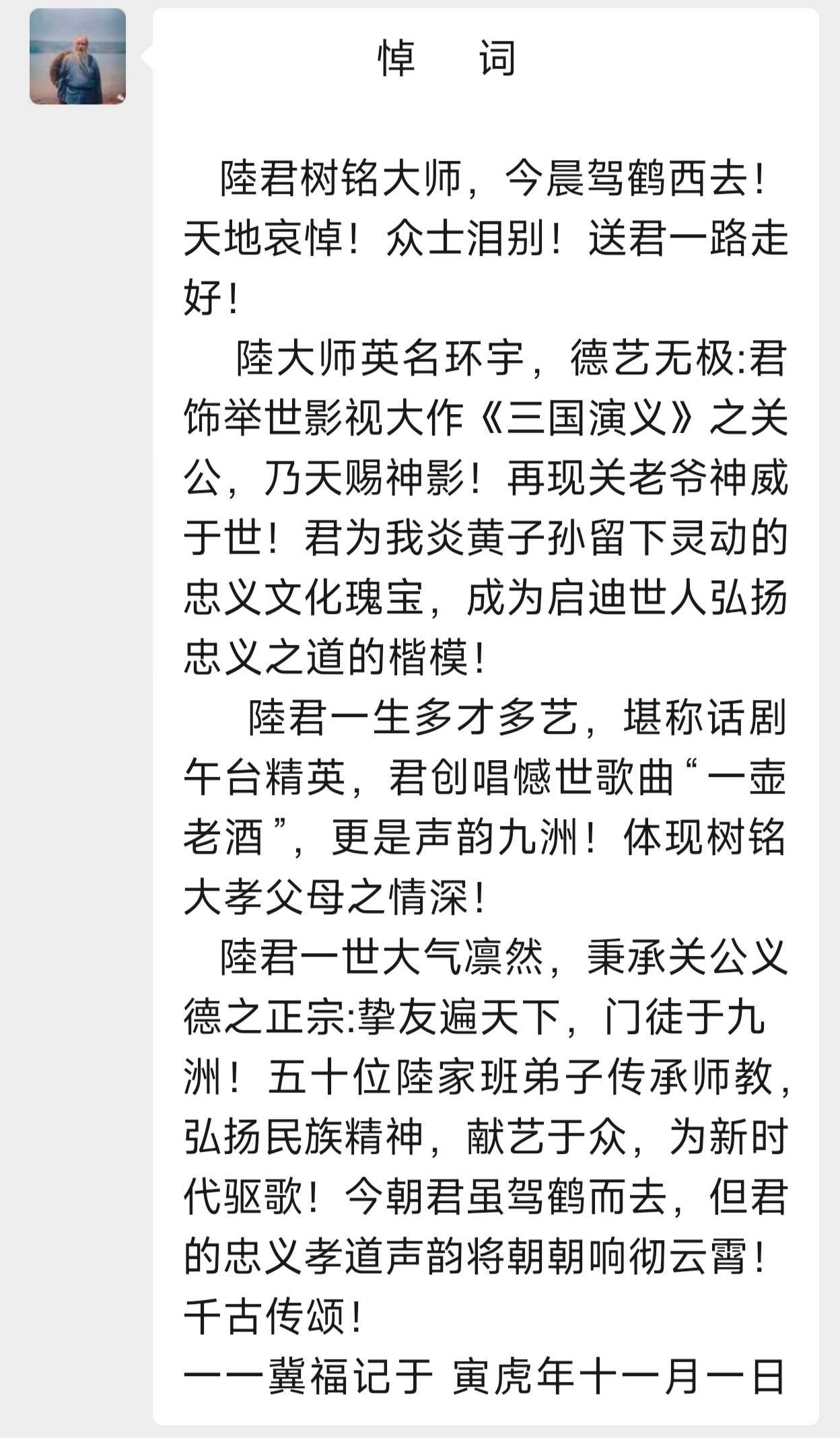 陆树铭生前好友、著名秦腔表演艺术家冀福记为陆树铭写下悼词,其中写道:“陆大师英名环宇,德艺无极:君饰举世影视大作《三国演义》之关公,乃天赐神影!再现关老爷神威于世!君为我炎黄子孙留下灵动的忠义文化瑰宝,成为启迪世人弘扬忠义之道的楷模!”