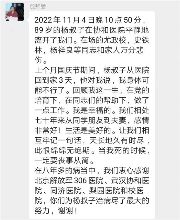 杨叔子院士的夫人、华科大教授徐辉碧介绍,11月4日22时53分,杨叔子院士在协和医院平静地离开了大家。先生逝世时,杨叔子院士的学生、华中科技大学校长尤政院士,华中科技大学教授史铁林以及华中科技大学教授杨祥良等同志和家人最后送别先生,大家均悲痛万分。