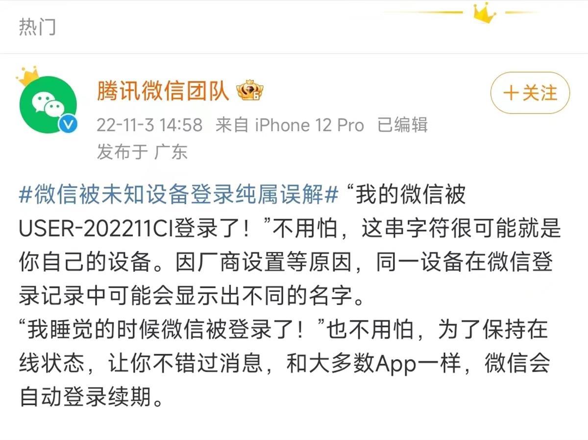 对于微信显示被陌生ID(如USER-202211CI)登录的问题,腾讯微信团队解释称,不用怕,这串字符很可能就是你自己的设备。因厂商设置等原因,同一设备在微信登录记录中可能会显示出不同的名字。