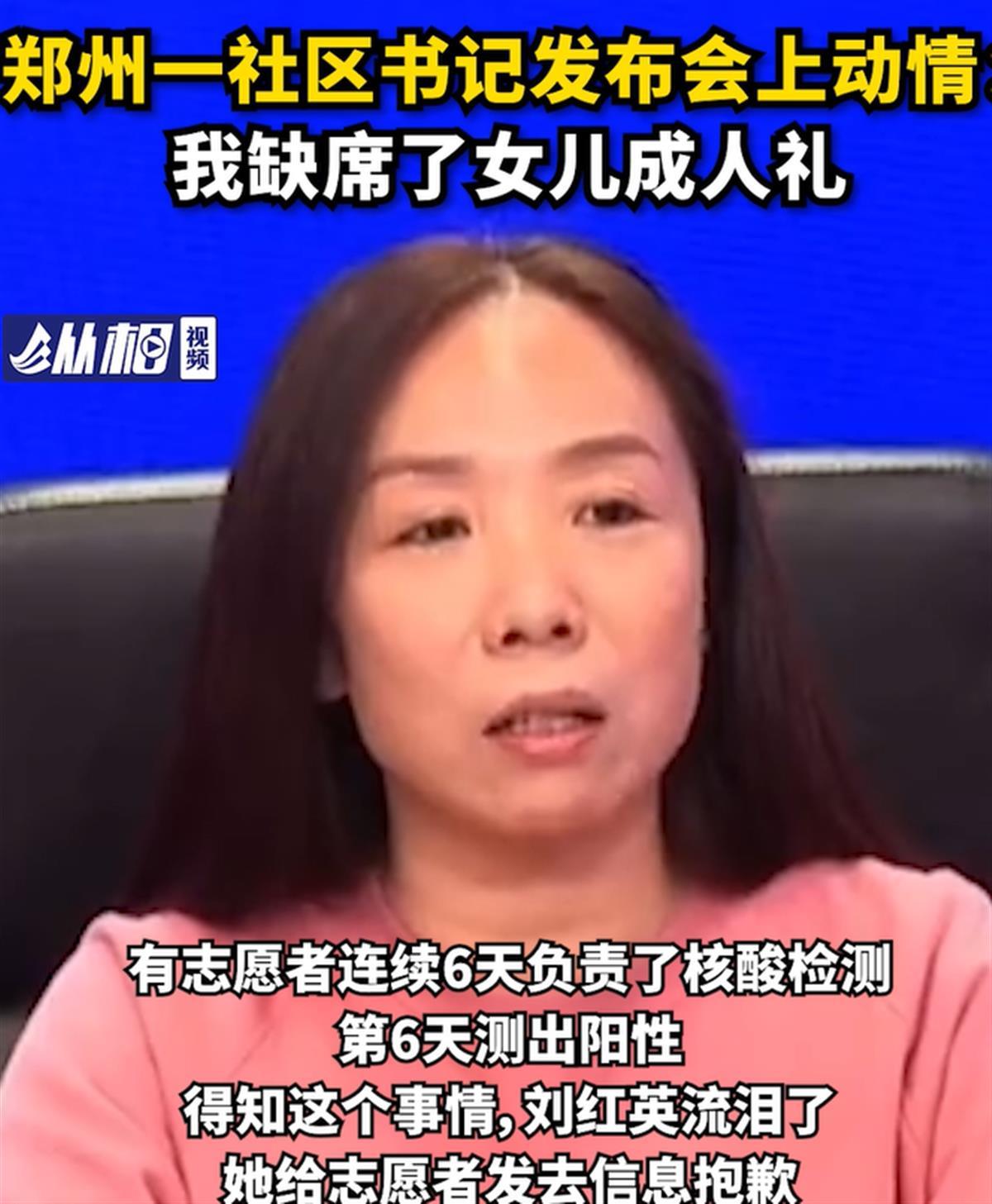 11月6日晚,郑州市召开新冠肺炎疫情防控新闻发布会,郑州市中原区桐柏路街道平安街社区党总支书记刘红英书记发言,讲述自己错过了女儿18岁生日,缺席了女儿成人礼。(据11月7日顶端新闻)