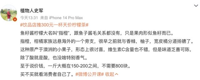 随后,中科院植物学博士、中国植物学会科学传播工作委员会成员史军在微博上“打假”,他表示,鱼籽酱柠檬大名叫“指橙”,跟鱼子酱没有任何关系,只是果肉形似鱼籽而已。价格一斤大概在150-200之间,并不需要800块。