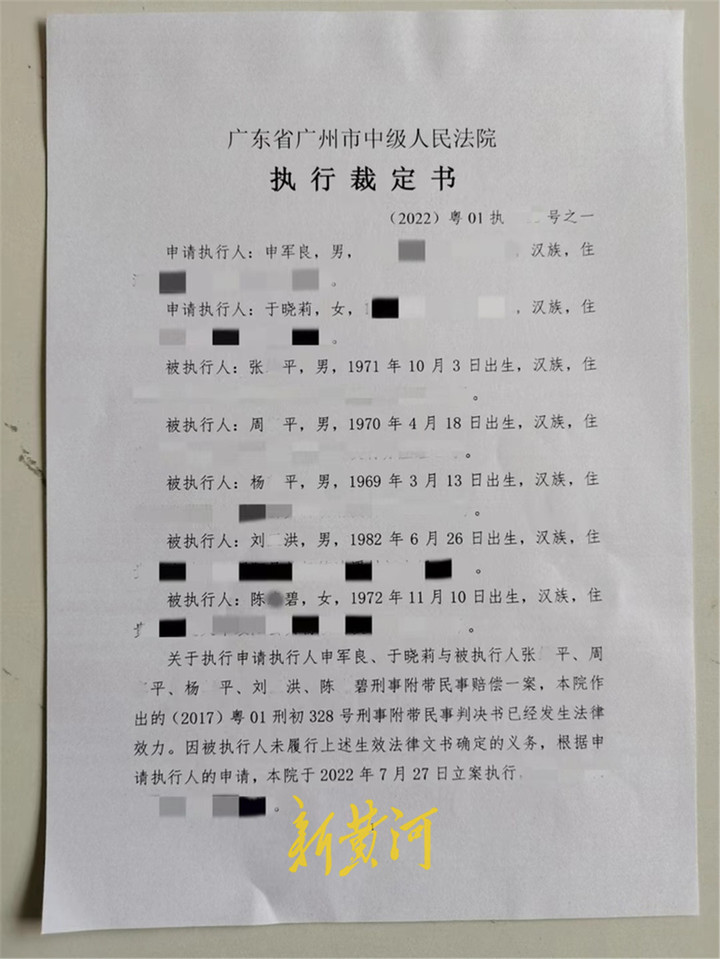 11月16日,申军良告诉新黄河记者,三天前,他收到了广州市中级人民法院寄来的《执行裁定书》,在法院、检察院等有关部门不断地努力下,最终查明申聪案中的一名主要案犯与其同为人贩子的妻子名下有一处可执行的房屋资产,该房产将于12月12日进行网络法拍,拍卖之后的款项中,一部分将用来支付受害家庭在该案中的民事赔偿部分,也就是说,申军良将有望获得民事赔偿。