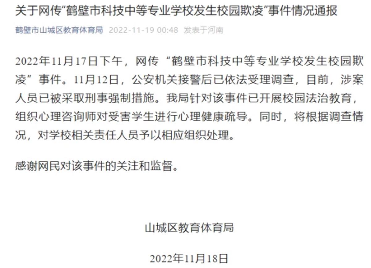鹤壁市山城区教育体育局微信公众号19日凌晨发布《关于网传“鹤壁市科技中等专业学校发生校园欺凌”事件情况通报》,通报称:2022年11月17日下午,网传“鹤壁市科技中等专业学校发生校园欺凌”事件。11月12日,公安机关接警后已依法受理调查,目前,涉案人员已被采取刑事强制措施。