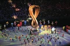 烟花腾空,一个本届世界杯的巨型会徽造型出现在场地中央。卡塔尔世界杯会徽基于“大力神杯”的原型设计,又如同数字“8”,象征着本届杯赛的8座球场。2022年卡塔尔世界杯就此正式拉开大幕,这场足球盛宴将在未来近一个月时间里与世人相伴。钟合