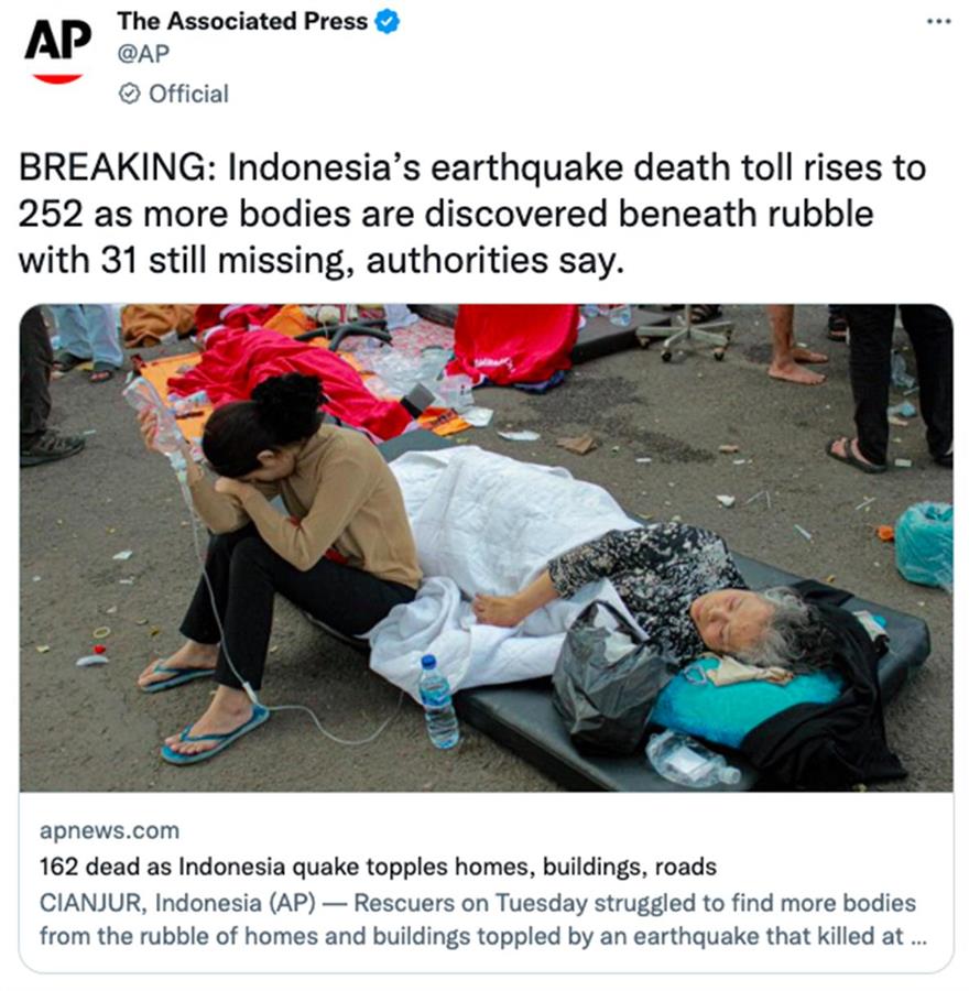 据美联社刚刚报道,印度尼西亚当局表示,随着更多的尸体从废墟中被找到,印尼西爪哇省地震死亡人数已上升至252人,与此同时,仍有31人下落不明。