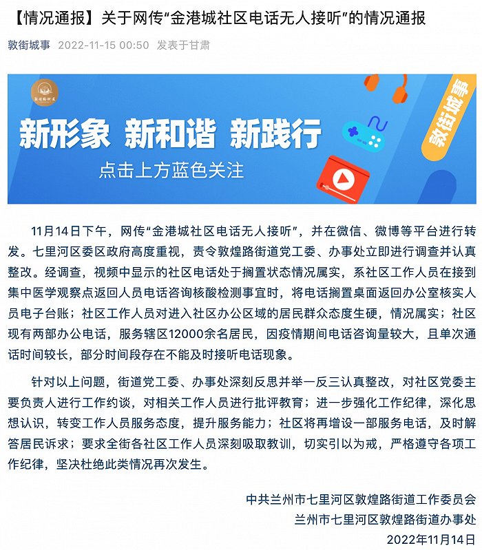 据“敦街城事”公众号,中共兰州市七里河区敦煌路街道工作委员会、兰州市七里河区敦煌路街道办事处发布情况通报,11月14日下午,网传“金港城社区电话无人接听”,并在微信、微博等平台进行转发。七里河区委区政府高度重视,责令敦煌路街道党工委、办事处立即进行调查并认真整改。经调查,视频中显示的社区电话处于搁置状态情况属实,系社区工作人员在接到集中医学观察点返回人员电话咨询核酸检测事宜时,将电话搁置桌面返回办公室核实人员电子台账;社区工作人员对进入社区办公区域的居民群众态度生硬,情况属实;社区现有两部办公电话,服务辖区12000余名居民,因疫情期间电话咨询量较大,且单次通话时间较长,部分时间段存在不能及时接听电话现象。