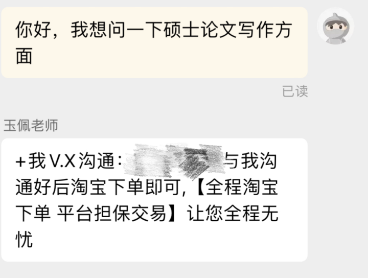 记者以学生身份问询论文代写情况,卖方无一例外地要求加微信或QQ进一步沟通。记者添加一名微信名为“顶墨文学社”的机构客服,他称,“代笔者为名校硕士或老师,具体身份信息保密。”另一个微信名为“夏露”的商家则称自己写论文“包质量、包通过,初稿完成后付清所有费用,不予以退款。”