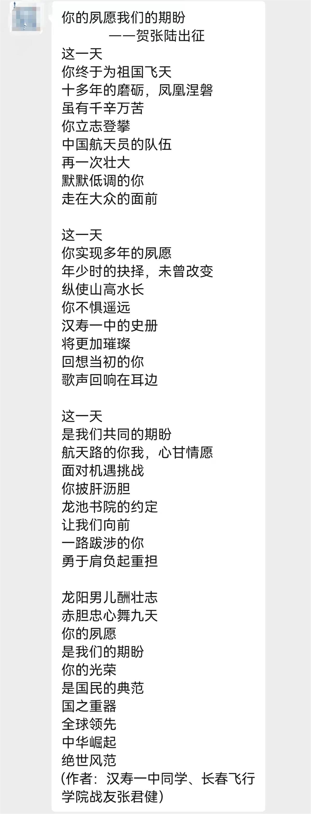 11月28日,身在吉林长春的张君健灵感迸发,为多年同学兼好友的航天员张陆创作了一首现代诗并发给了他,祝贺他历经多年磨炼,终于成功实现飞天梦想。