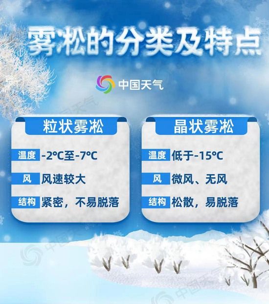 雾凇,既不是冰也不是雪,而是树枝上挂的小冰粒。雾凇可分为两种,一种是粒状雾凇,它往往在气温为-2℃~-7℃时、风速大时出现,是过冷却雾滴碰到冷的物体后迅速冻结成粒状的小冰块,结构较为紧密;另一种是晶状雾凇,往往在有雾、微风或静稳、温度低于-15℃时出现,由过冷却雾滴凝华而形成的晶状雾凇,结构较松散,稍有震动就会脱落。