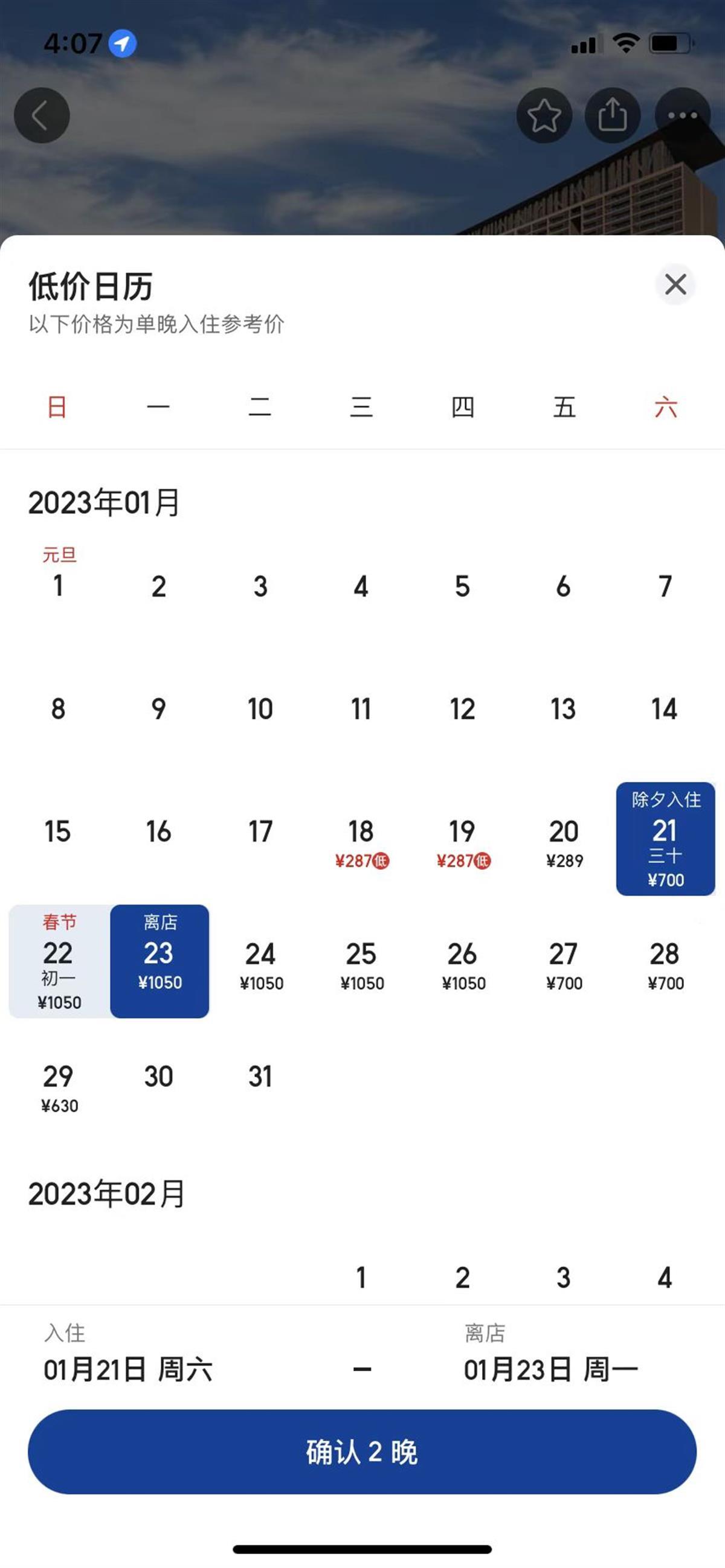 三亚湾红树林度假世界(木棉酒店)1月20日入住仅需289日一晚,但1月22日晚入住价格为1050元/晚,价格上涨2.5倍。