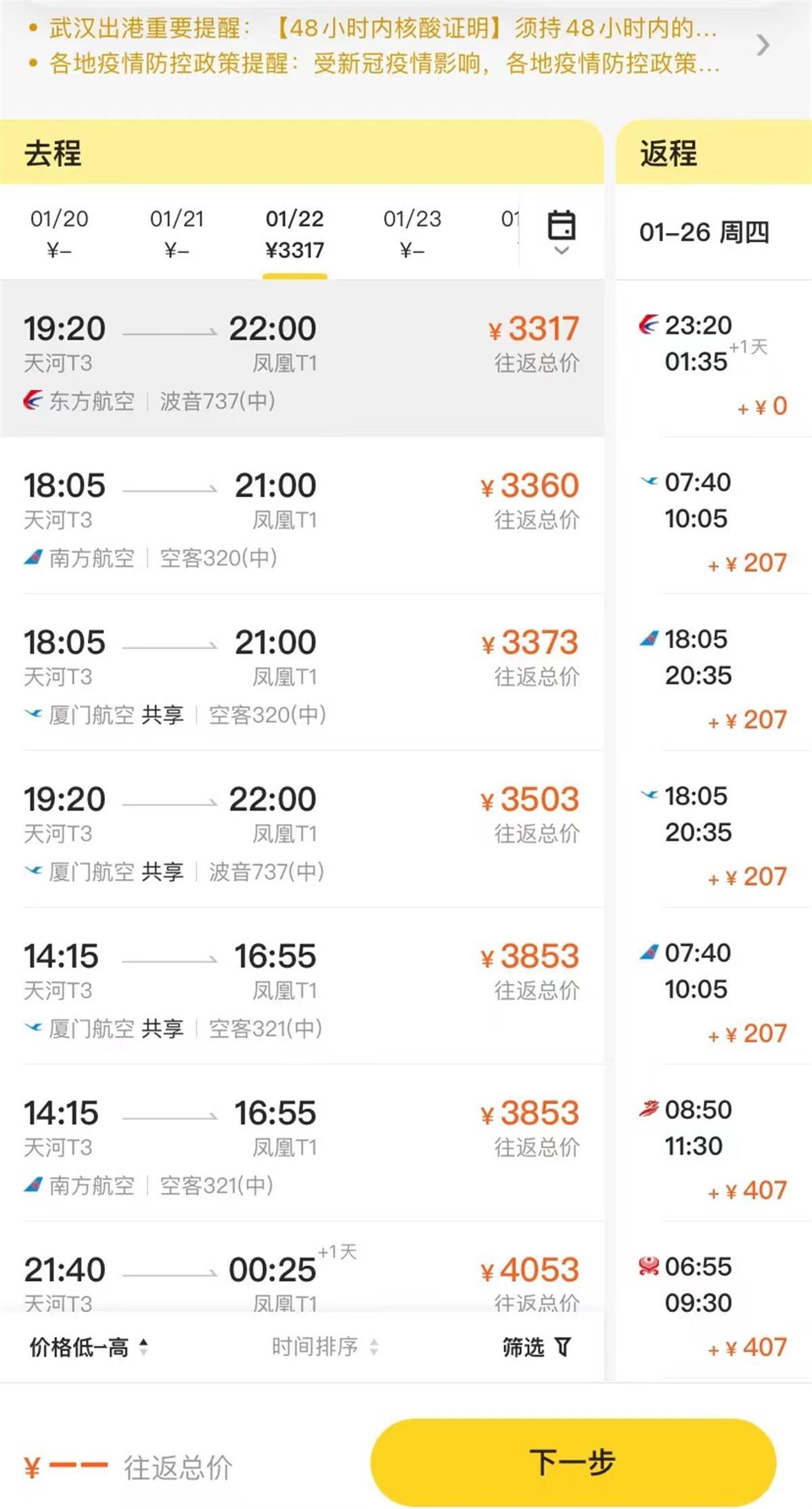 春节假期期间从武汉往返三亚机票价格