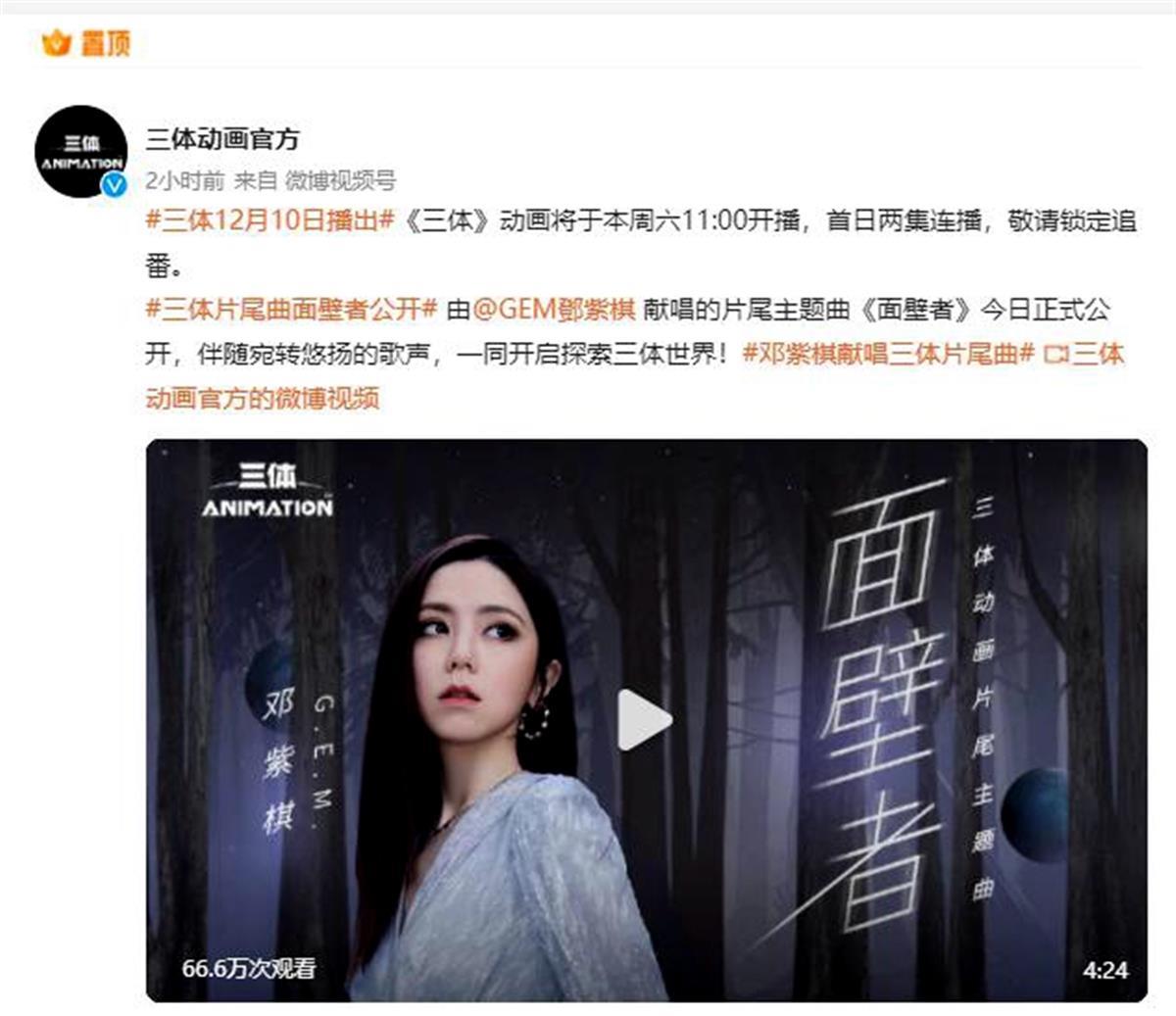 随着定档消息一同发布的,还有由邓紫棋献唱的片尾主题曲《面壁者》,还有第四位面壁者的人身安全负责人——史强的剧照。邓紫棋在微博中写道:很荣幸为《三体》动画献唱片尾主题曲《面壁者》,面壁计划在《三体》中也是至关重要的一项计划行动,让我们一起期待本周六的动画上线吧!