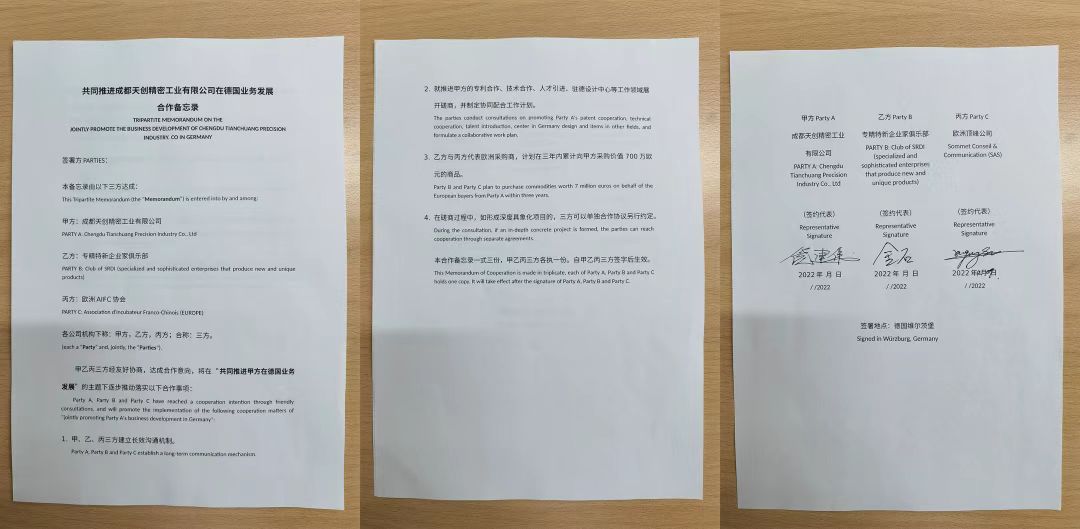 在维尔兹堡,欧洲AIFC协会与成都天创精密工业有限公司、欧洲顶峰公司与成都晶宝时频技术股份有限公司进行了合作备忘录的签署。