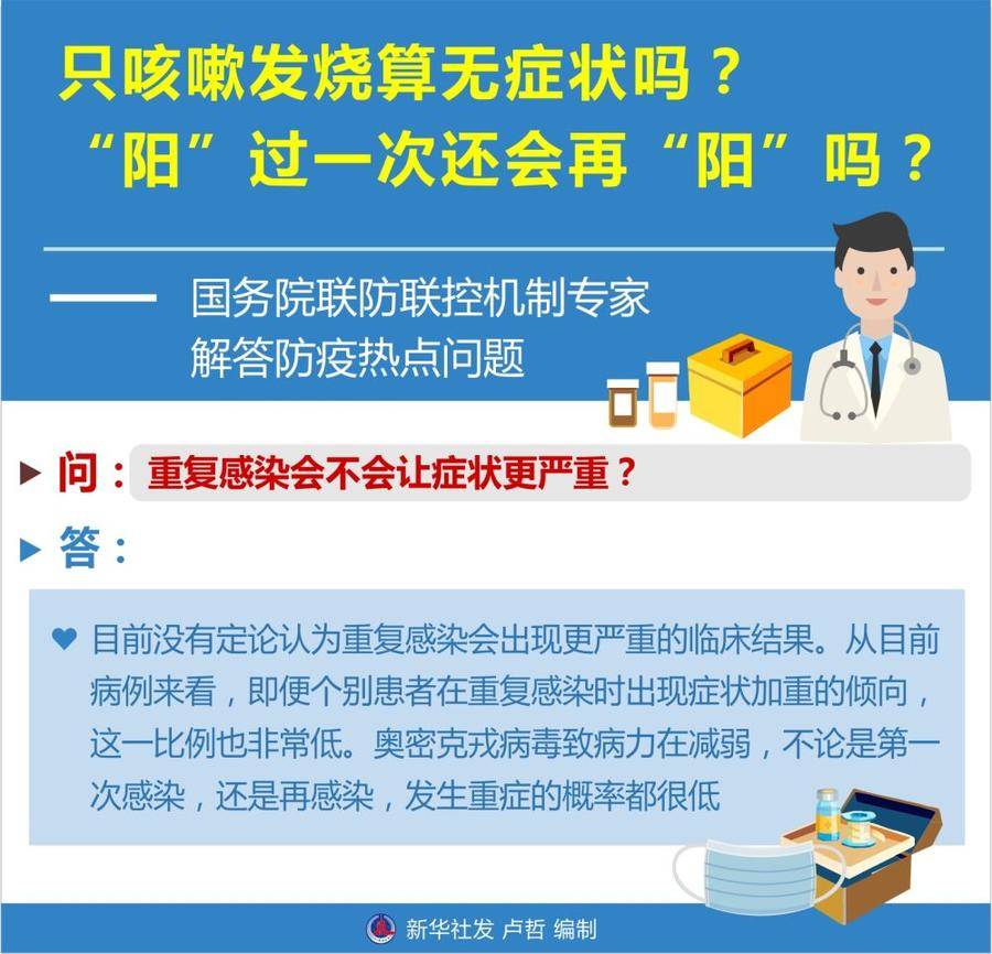 答:目前没有定论认为重复感染会出现更严重的临床结果。从目前病例来看,即便个别患者在重复感染时出现症状加重的倾向,这一比例也非常低。奥密克戎病毒致病力在减弱,不论是第一次感染,还是再感染,发生重症的概率都很低。