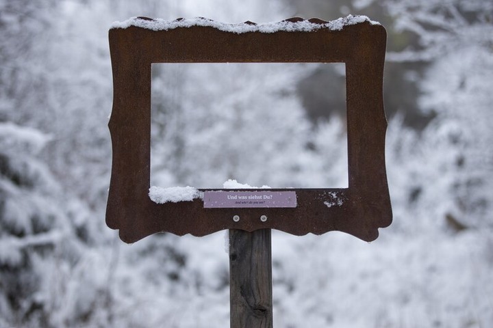 12月10日,德国北莱茵-威斯特法伦州Bruchhausen,该地附近被雪覆盖的木质框架上面写着你看到了什么?