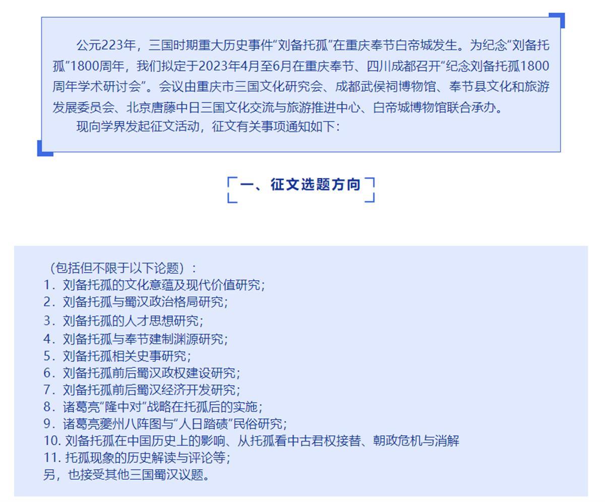 征文的选题方向,包括但不限于“刘备托孤的文化意蕴及现代价值研究”“刘备托孤在中囯历史上的影响、从托孤看中古君权接替、朝政危机与消解”等,还提到也接受其他三国蜀汉议题。