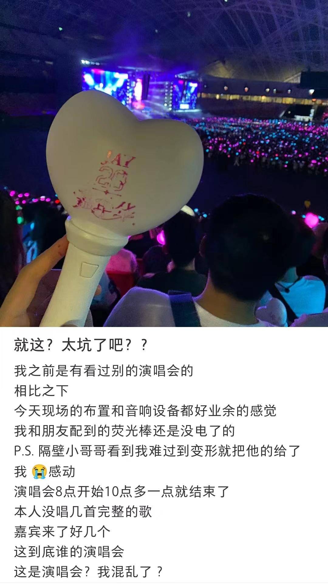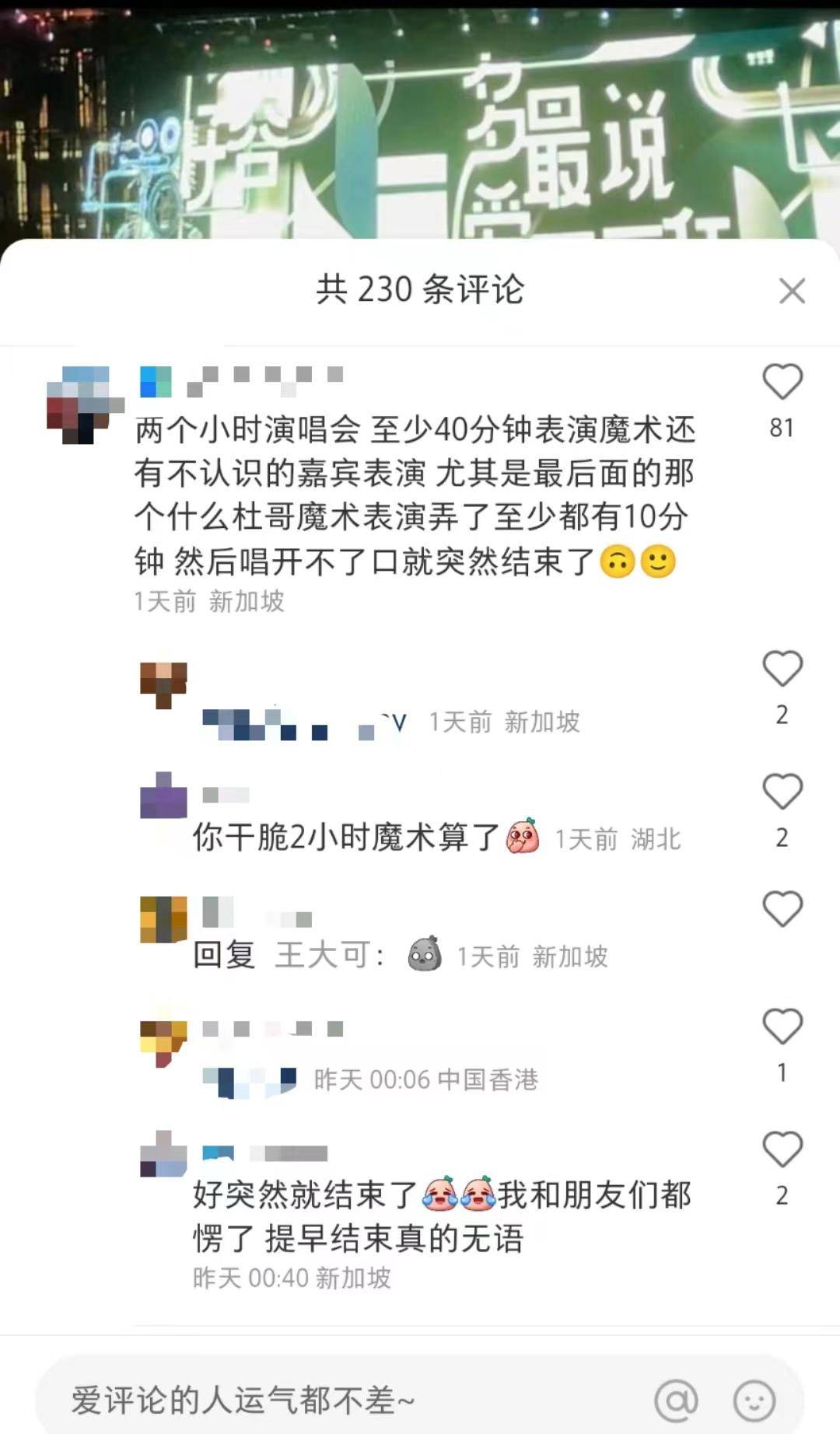 第二是时间问题,演唱会按照预定会在八点开始,却并没有准点开场,但十点十五分就猝不及防的结束了,“两个小时演唱会,至少40分钟表演魔术,还有不认识的嘉宾表演,尤其是最后面的那个什么杜哥魔术弄了至少都有10分钟,然后就突然结束了。”一名观众对于这场演出的时间安排表示了不满意,“好突然就结束了,我和朋友都愣了,提早结束真的无语。”另一名观众也对此表示了不满。