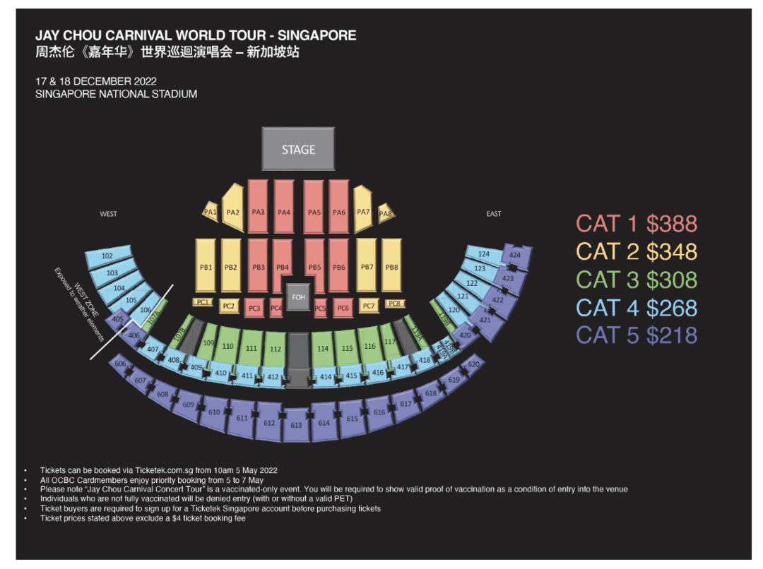 根据新加坡媒体《联合早报》报道,该场演唱会于今年5月5日上午十点开卖,场面非常火爆,网络甚至一度瘫痪,到6日上午已经卖出9成,共5万张门票。从官网票价图可以看出,该场演唱会分为四个价位梯度售票,最高价位新加坡币388元,依当前汇率折合人民币约1998元,最低价位新加坡币218元,依当前汇率折合人民币约1123元,门票价格不菲。