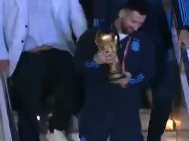 “Tycsports”网站报道中的视频画面显示,梅西手捧大力神杯下飞机。