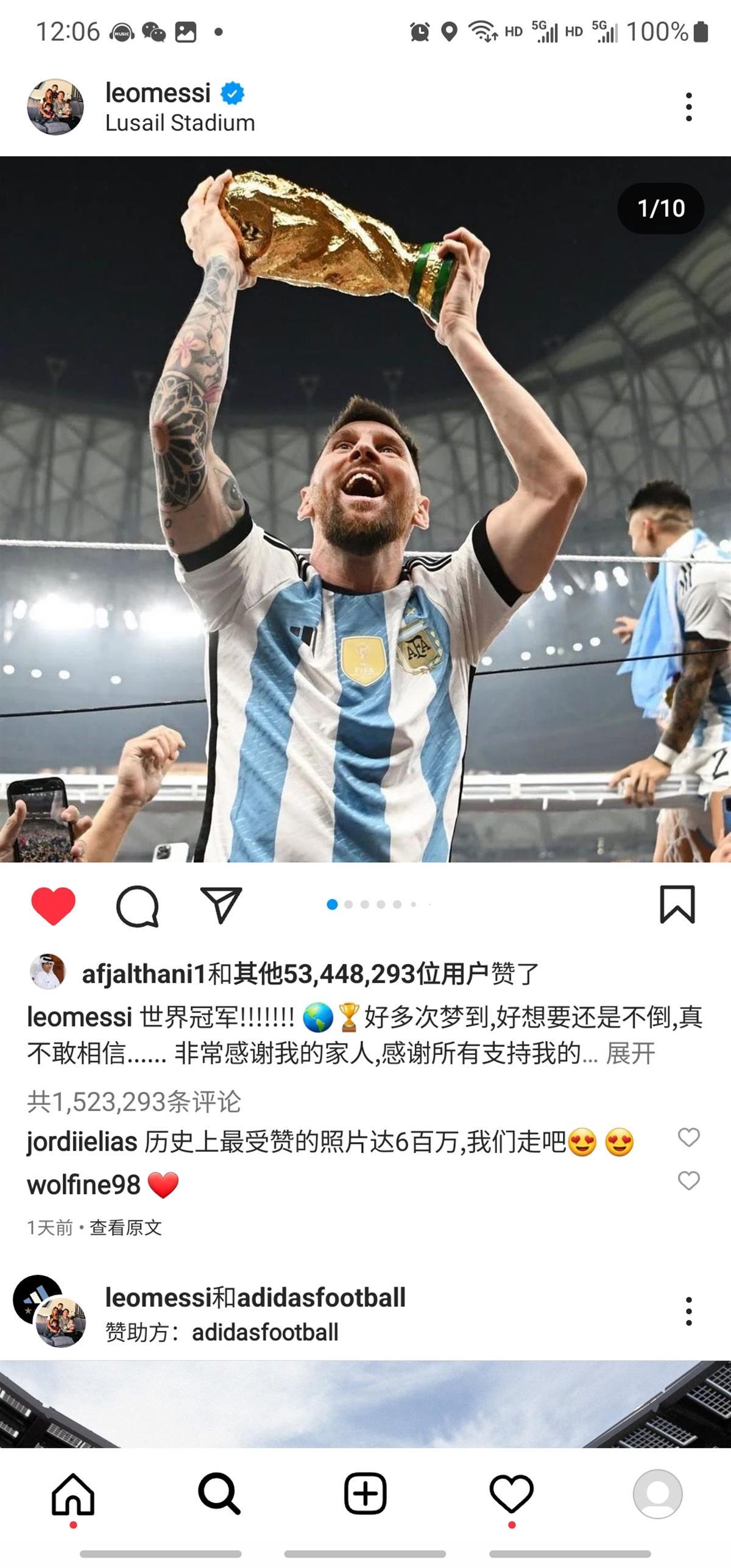 阿根廷世界杯夺冠后,梅西在全球最大图片社交平台instagram上发布了自己手捧大力神杯等一组照片,该动态随后超越了C罗此前发布的“梅罗对弈”动态,成为instagram平台体育类点赞数第一。