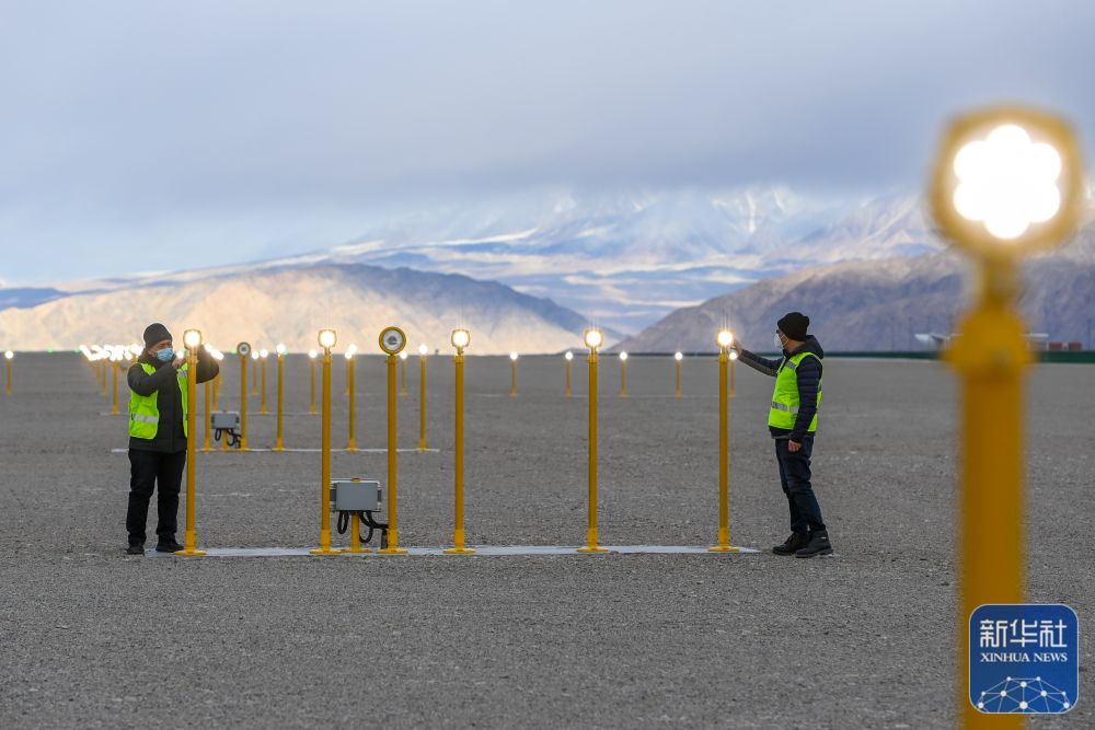 12月19日,在塔什库尔干红其拉甫机场,工作人员检查助航灯光系统。新华社记者 丁磊 摄
